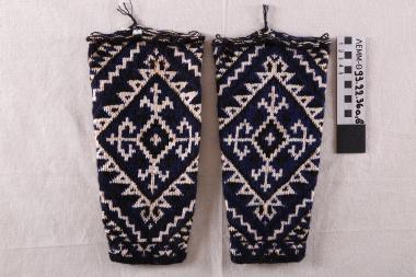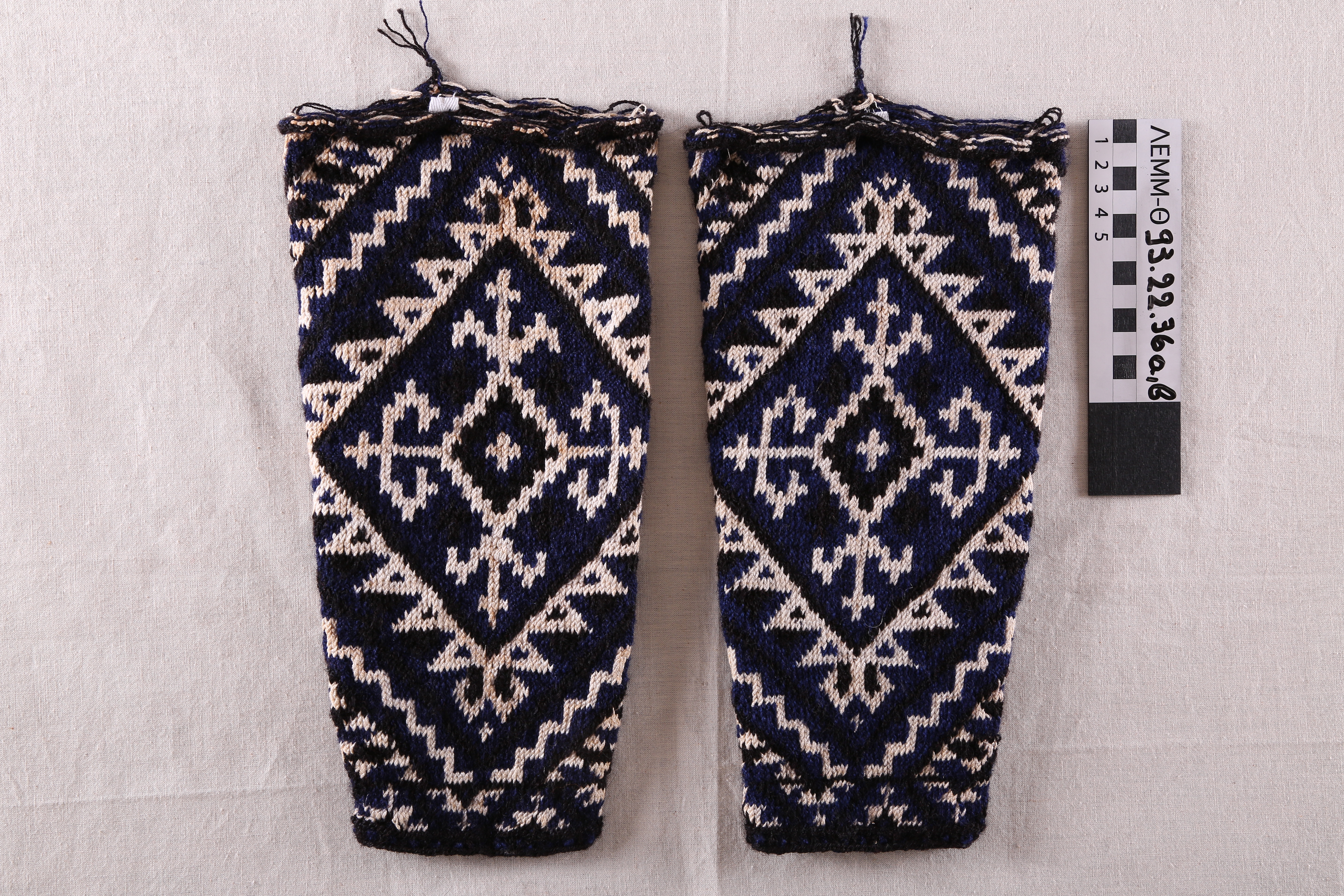 Κάλτσες (ζεύγος) - περικνημίδες μάλλινες πλεκτές σε χρώματα μπλε, μαύρο και λευκό, με γεωμετρικά σχέδια, με κεντρικό μοτίβο ρόμβου που εσωκλείει σταυρόσχημο λευκό μοτίβο και έναν μικρό λευκό ρόμβο με σταυρό στο κέντρο. Σαρακατσάνικες