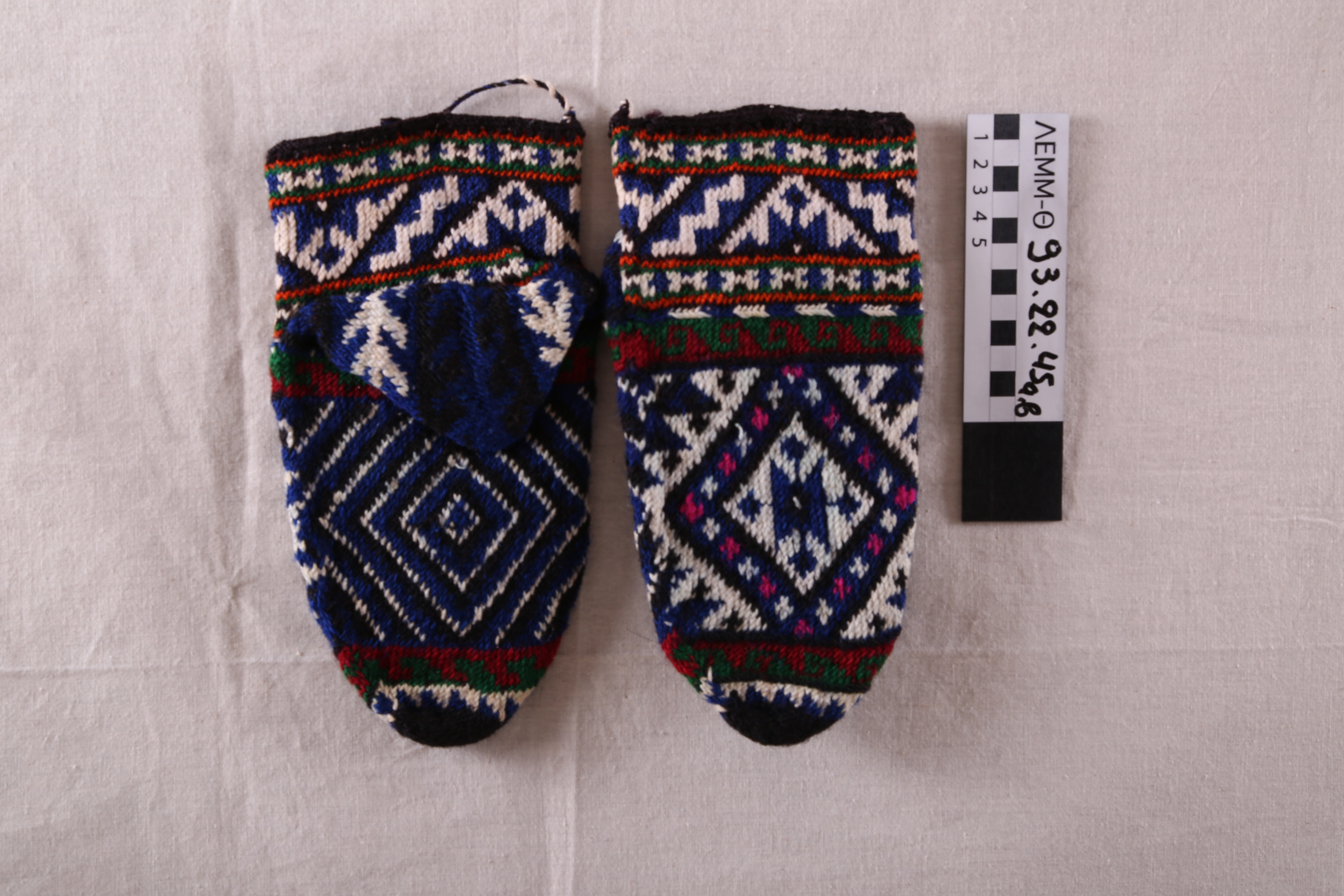 Κάλτσες (ζεύγος) - κάλτσες μάλλινες πλεκτές κοντές, με φτέρνα, πολύχρωμες, με γεωμετρικά σχέδια, με κεντρικό μοτίβο ρόμβου που εσωκλείει σταυροειδή σχηματισμό με μοτίβο καρουλιού στο κέντρο· ζώνες με σταυρουδάκια, με μαίανδρο και στον κορμό ζώνη με τεθλασ