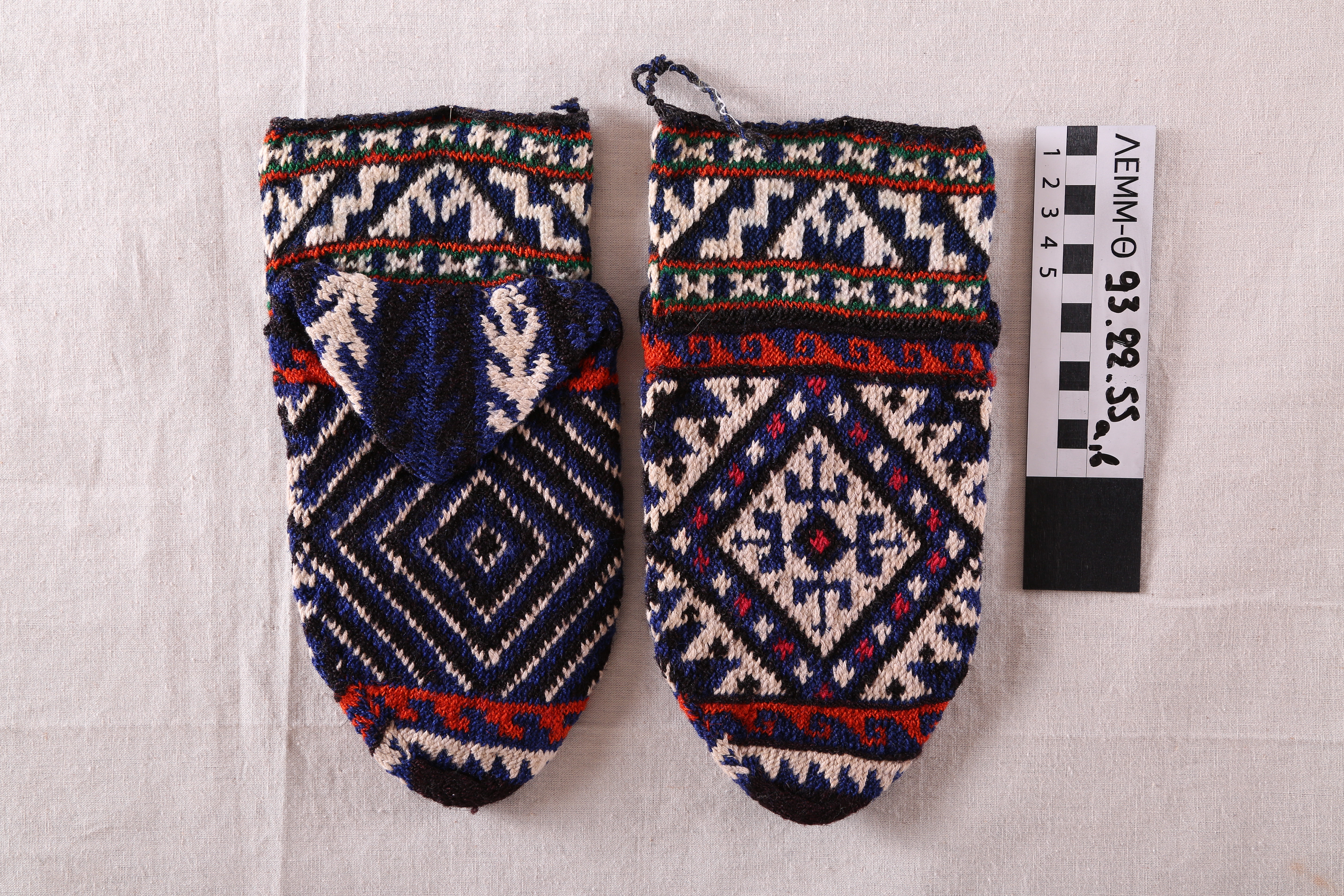 Κάλτσες (ζεύγος) - κάλτσες μάλλινες πλεκτές κοντές, με φτέρνα, πολύχρωμες, με γεωμετρικά σχέδια, με κεντρικό μοτίβο ρόμβου που εσωκλείει σταυροειδή σχηματισμό με αγκύλες στις κεραίες· ζώνες με σταυρουδάκια, με μαίανδρο και στον κορμό ζώνη με τεθλασμένες γ