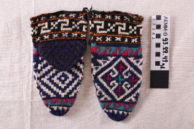 Κάλτσες (ζεύγος) - κάλτσες μάλλινες πλεκτές κοντές, με φτέρνα, πολύχρωμες, με γεωμετρικά σχέδια, με κεντρικό μοτίβο λευκού ρόμβου που εσωκλείει ρόμβους μπλε που συνθέτουν σταυρό και εσωκλείουν σταυρουδάκι· ζώνες με μαίανδρο και στον κορμό ζώνη με μαιάνδρο (EL)