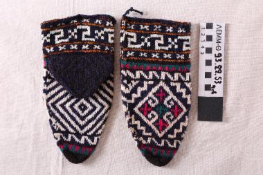 Κάλτσες (ζεύγος) - κάλτσες μάλλινες πλεκτές κοντές, με φτέρνα, πολύχρωμες, με γεωμετρικά σχέδια, με κεντρικό μοτίβο λευκού ρόμβου που εσωκλείει ρόμβους μπλε που συνθέτουν σταυρό και εσωκλείουν σταυρουδάκι· ζώνες με οδοντωτές σειρές και στον κορμό ζώνη με