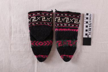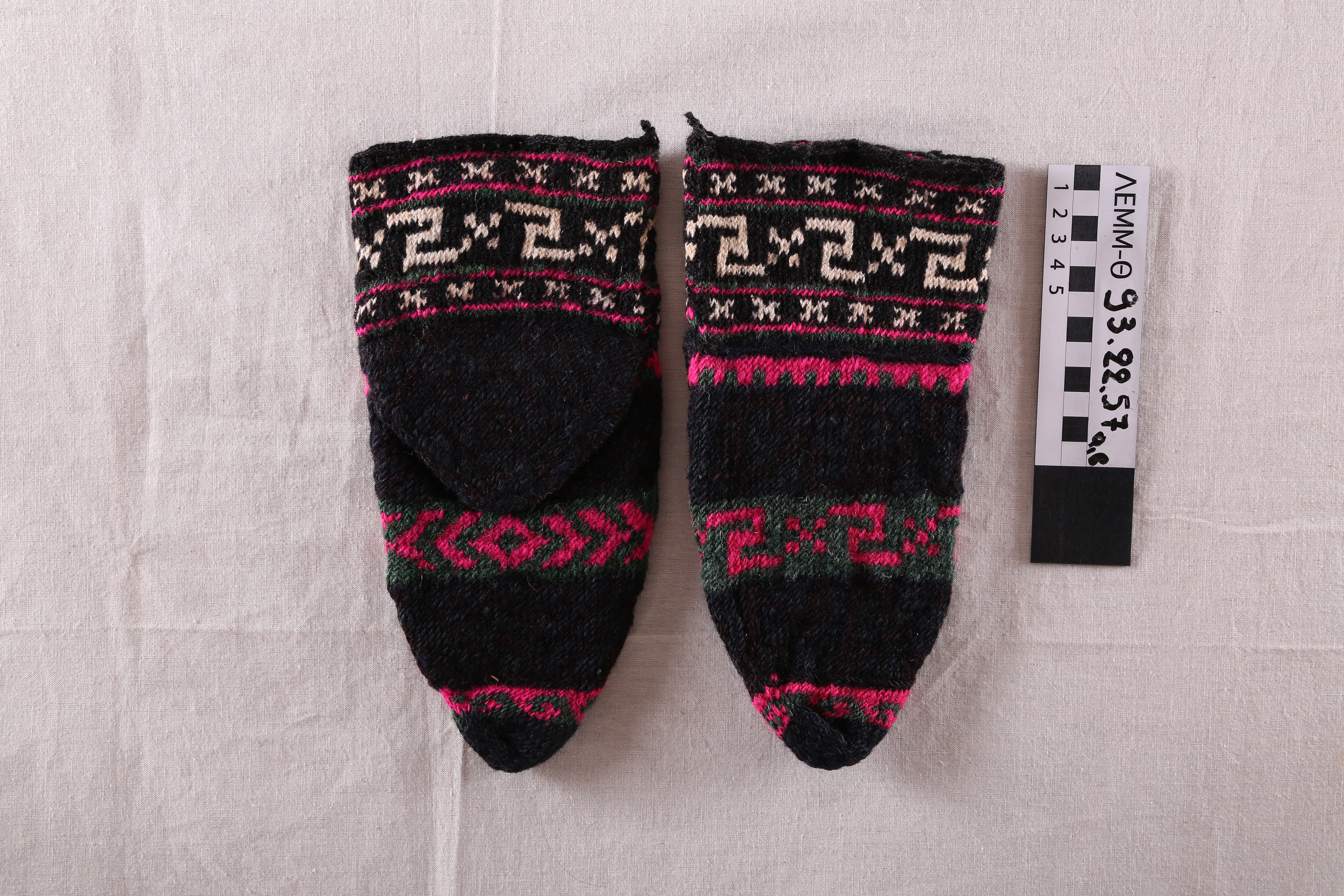 Κάλτσες (ζεύγος) - κάλτσες μάλλινες πλεκτές κοντές, με φτέρνα, πολύχρωμες, με γεωμετρικά σχέδια, με κεντρική ζώνη με μαιάνδρους φούξια που εναλλάσσονται με μοτίβα "χ" σε φόντο πράσινο· στον κορμό ζώνη με μαιάνδρους λευκούς που εναλλάσσονται με μοτίβα "χ".