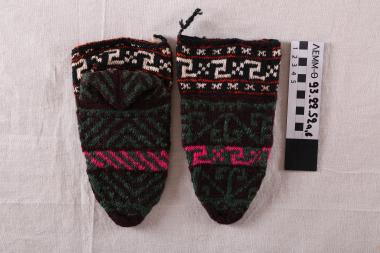Κάλτσες (ζεύγος) - κάλτσες μάλλινες πλεκτές κοντές, με φτέρνα, με πολύχρωμα γεωμετρικά σχέδια σε φόντο μαύρο και μπλε-μαύρο, με κεντρική ζώνη μαιάνδρων φούξια που εναλλάσσονται με μοτίβα "χ" σε φόντο πράσινο και ζώνες τεθλασμένης γραμμής πράσινης με μοτίβ