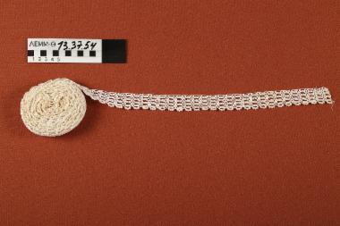 πλεκτή με βελονάκι, βαμβακερή σε λευκό χρώμα. Με γεωμετρικά μικρά μοτίβα και στις άκρες φέρει διάκοσμο με μπιμπίλα. Είναι τυλιγμένο σε ρολό και φέρει αρκετές κηλίδες.