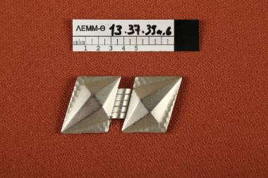 μεταλλική σε ασημί χρώμα. Αποτελείται από δύο τμήματα που συνδέονται μεταξύ τους με πλατύ μεταλλικό άγκιστρο. 'Εχουν ασύμμετρο ρομβοειδές σχήμα και ανάγλυφη διακόσμηση σε μοτίβο κοχυλιού και περιμετρικά μικρές κυψέλες. Και στα δύο τμήματα στην πίσω όψη φέρουν κάθετες μεταλλικές ταινιές απο τις οποίες περνούσε η ζώνη. Φέρει μερική οξείδωση