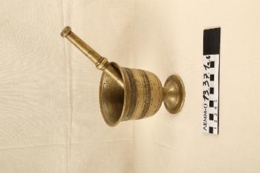 α) γουδί χάλκινο σε σχήμα καμπάνας με μικρό ποδαράκι. Περιμετρικά φέρει δύο σειρές από εγχάρακτα σχέδια.β) γουδοχέρι χάλκινο με φαρδιά απόληξη στο κάτω μέρος και ανάγλυφο δακτύλιο στο μέσο.