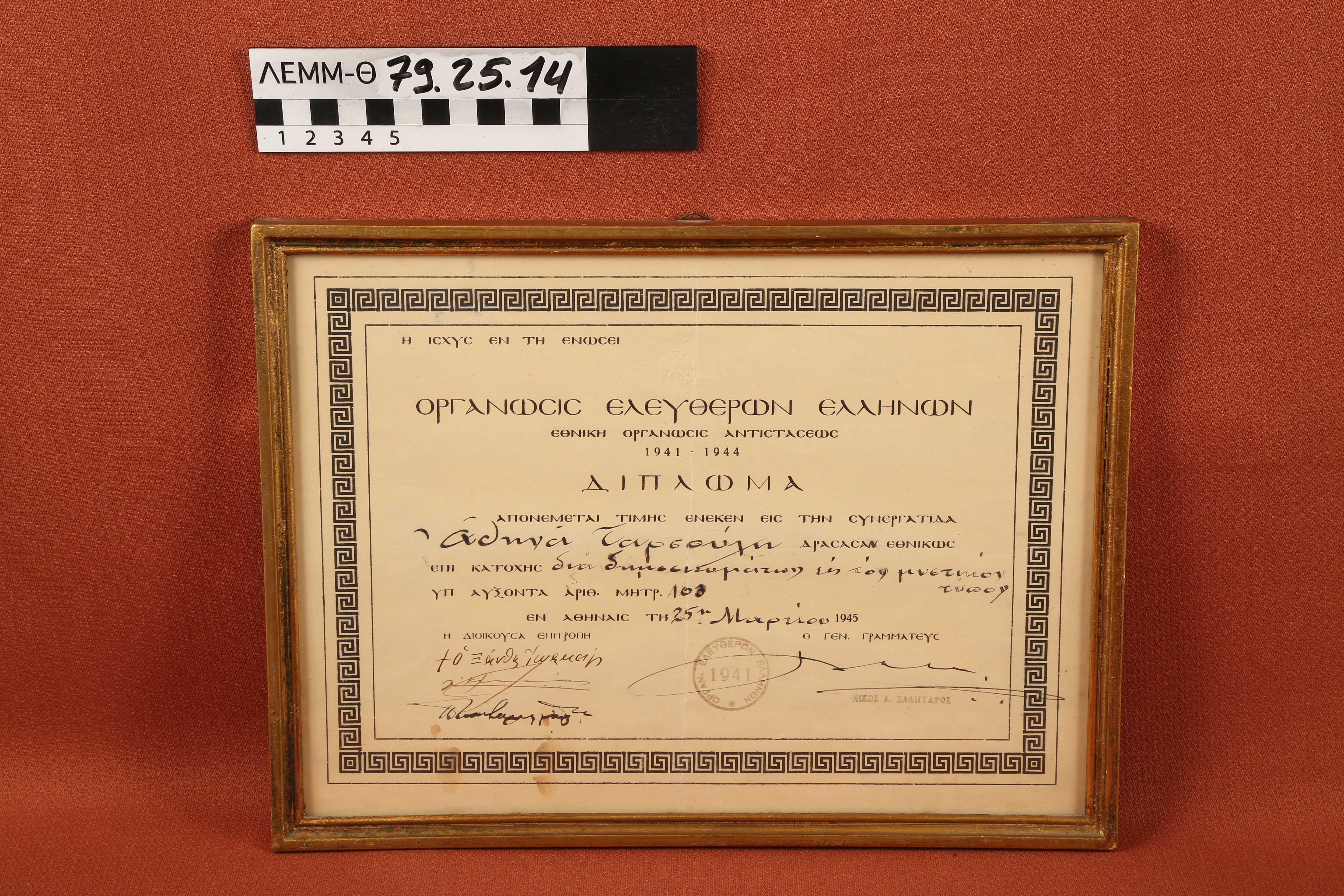 Δίπλωμα με κορνίζα - δίπλωμα από την ΟΡΓΑΝΩΣΗ ΕΛΕΥΘΕΡΩΝ ΕΛΛΗΝΩΝ, Εθνική Οργάνωσις Αντιστάσεως, της Αθηνάς Ταρσούλη, σε ξύλινη κορνίζα, Αθήνα 1945