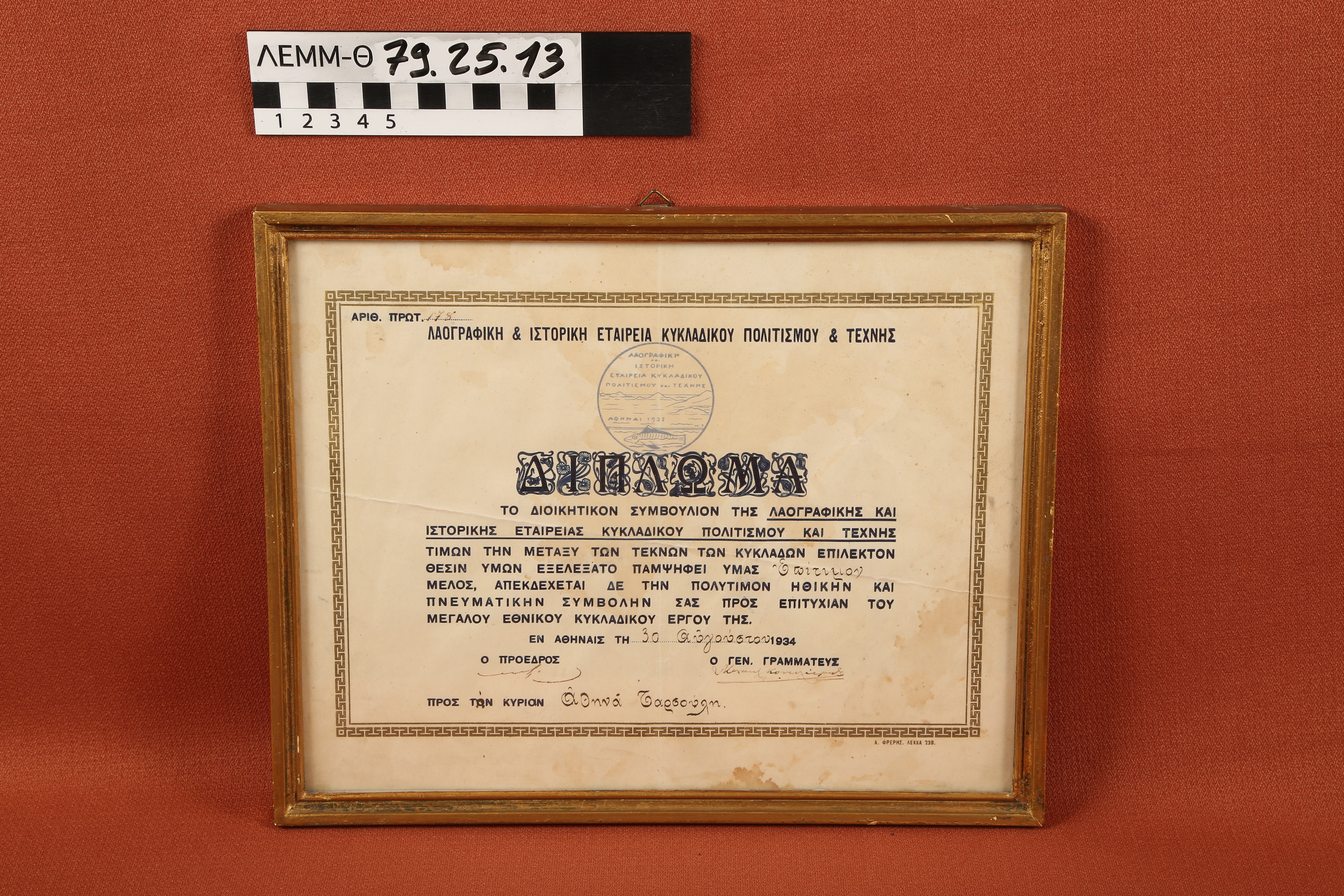 Δίπλωμα με κορνίζα - δίπλωμα από την Λαογραφική και Ιστορική Εταιρεία Κυκλαδικού Πολιτισμού και Τέχνης,της Αθηνάς Ταρσούλη, σε ξύλινη κορνίζα