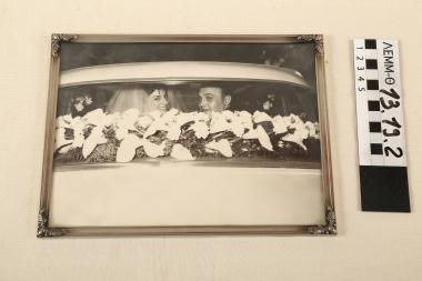 Φωτογραφία με κορνίζα - γαμήλια φωτογραφία (ζευγάρι στο αυτοκίνητο) με μεταλλική κορνίζα, 1962