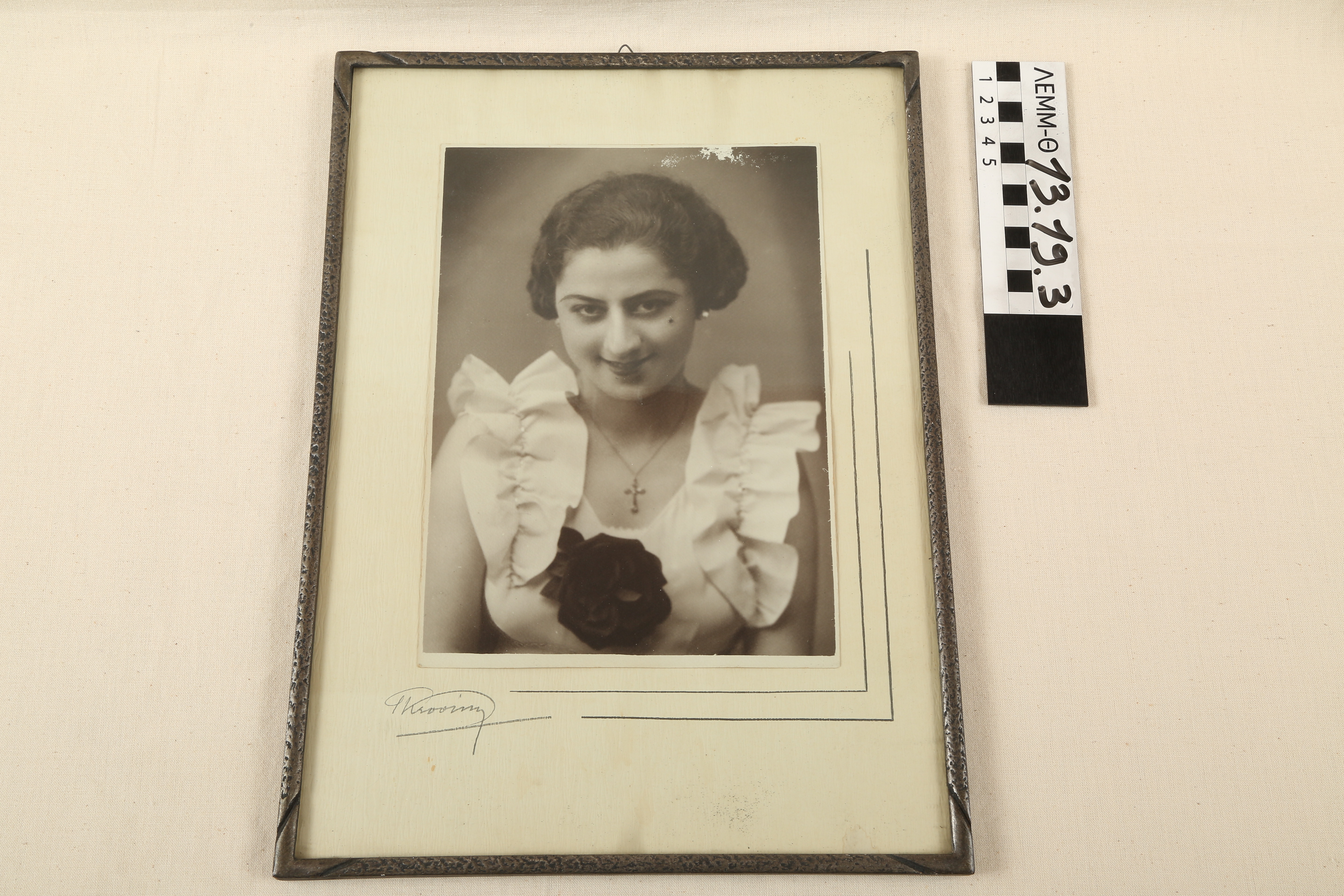 Φωτογραφία με κορνίζα - φωτογραφία, σε ξύλινη κορνίζα, στην οποία απεικονίζεται η μητέρα της δωρήτριας σε νεαρή ηλικία