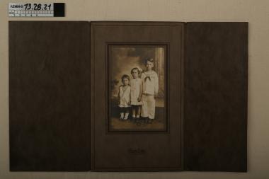 Φωτογραφία - φωτογραφία σε εκτύπωση σέπια και τρίφυλλη, χάρτινη καφέ κορνίζα, απεικονίζονται τρία μικρά παιδιά