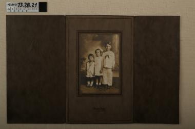 σέπια φωτογραφία, στην οποία απεικονίζονται δύο αγοράκια και ένα κοριτσάκι, τραβηγμένη σε στούντιο φωτογράφισης. Η φωτογραφία είναι επικολλημένη σε χάρτινη κορνίζα η οποία αποτελείται από τρία φύλλα, ένα στο κέντρο και δύο μικρότερα στο πλάι τα οποία διπλώνουν κ κλείνουν την κορνίζα. Κάτω από την φωτογραφία φέρει τυπωμένη την επιγραφή "Bertin Studio 454 Third Avenue, N.Y.". Η κορνίζα είναι ανάγλυφη με ανθικά μοτίβα.