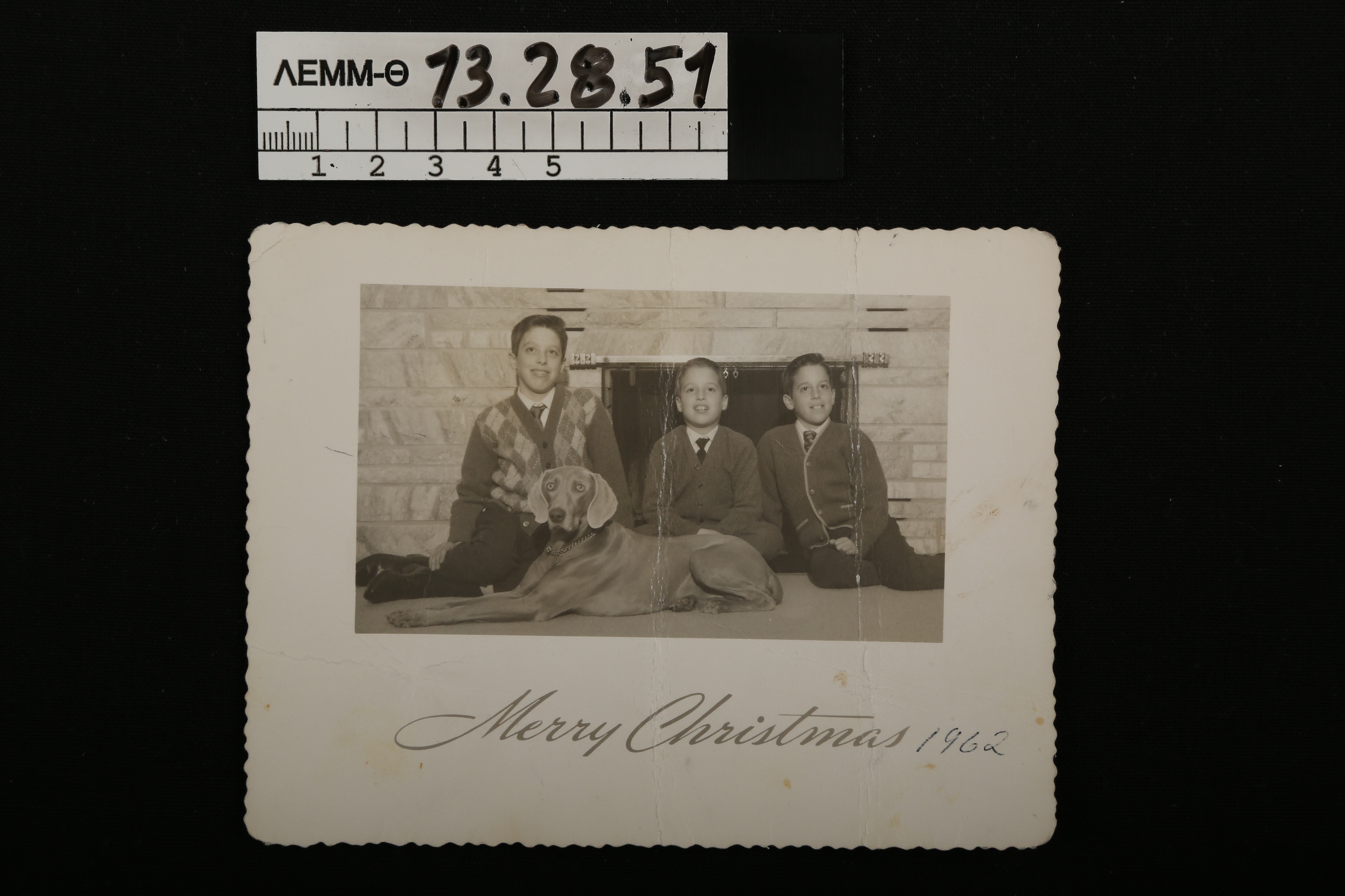 Ευχητήρια κάρτα - χριστουγεννιάτικη κάρτα με ασπρόμαυρη φωτογραφία στην οποία απεικονίζονται τρία παιδιά με ένα σκυλί, 1962