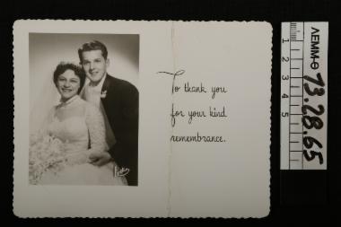 λευκή, χάρτινη, μονόφυλλη κάρτα με κυματιστές απολήξεις. Στην μπροστινή όψη φέρει ασπρόμαυρη φωτογραφία του ζεύγους (Αριστείδης Βέρος και Μαρία Βέρου) και την υπογραφή του φωτογραφικού στούντιο "Lorstan". Στην πίσω όψη φέρει την χειρόγραφη υπογραφή "Μαρία και Αριστείδης".