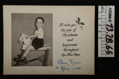 λευκή, χάρτινη, μονόφυλλη κάρτα. Στην μπροστινή όψη , στην αριστερή πλευρά, φέρει ασπρόμαυρη φωτογραφία στην οποία απεικονίζεται ο Αλκιβιάδης Βέρος (Alex) καθισμένος σε ξύλινο αλογάκι. Στην δεξιά πλευρά έχει τυπωμένη επιγραφή με χριστουγεννιάτικη ευχή και χρωματιστό σχέδιο γκι, και χειρόγραφη υπογραφή "Clem, Rose + Alex Veros". Στην πίσω όψη φέρει χειρόγραφη σήμανση "εις την θείαν Μαρίτσα".