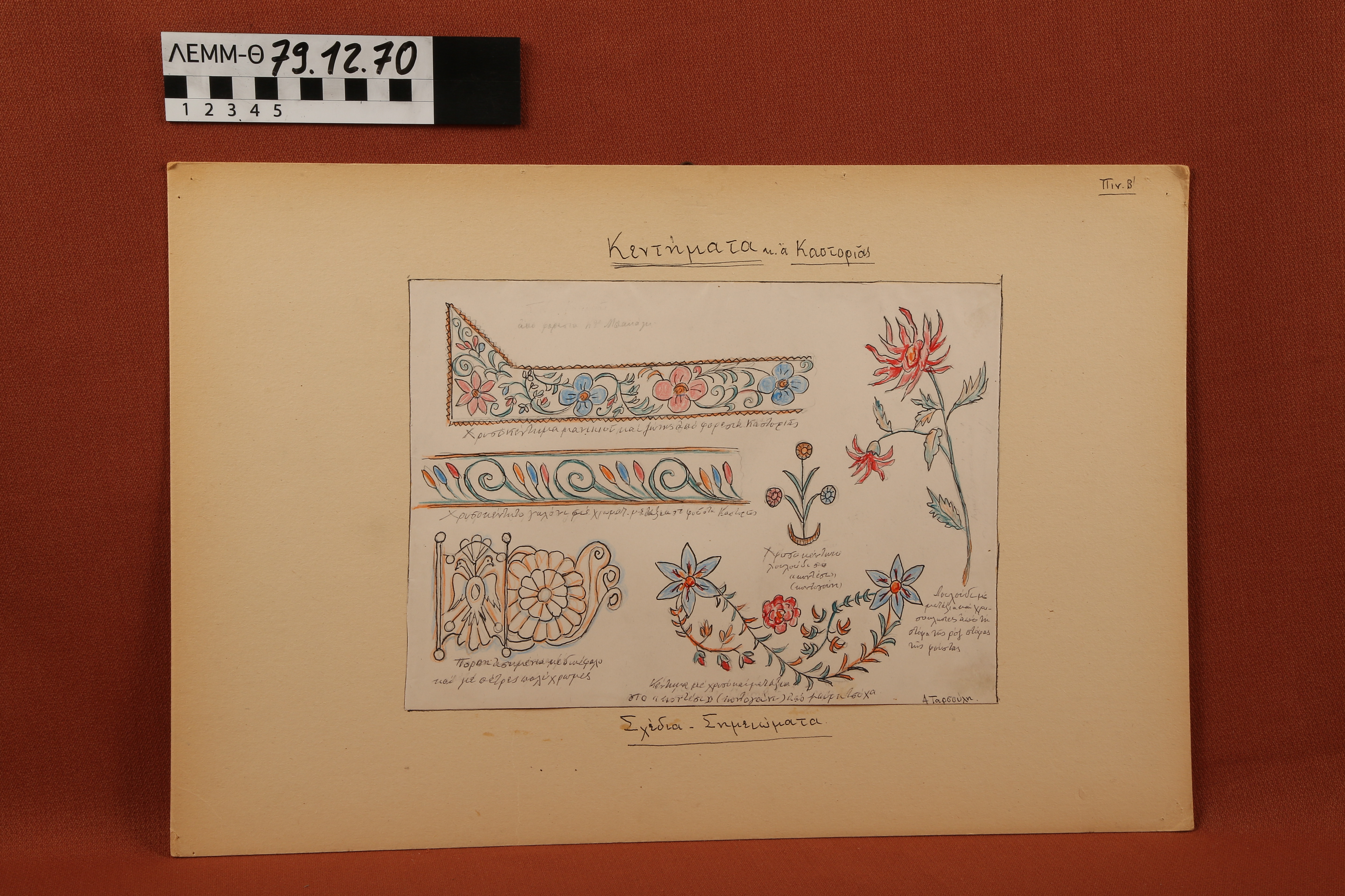 Σχέδια - πέντε πολύχρωμα σχέδια κεντημάτων και μιας πόρπης από τη περιοχή της Καστοριάς
