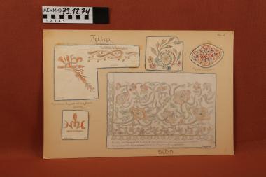 Σχέδια - τέσσερα σχέδια κεντημάτων και ένα σχέδιο καρφίτσας, επικολλημένα σε χαρτόνι, από την περιοχή της Πρέβεζας και της Κύθνου
