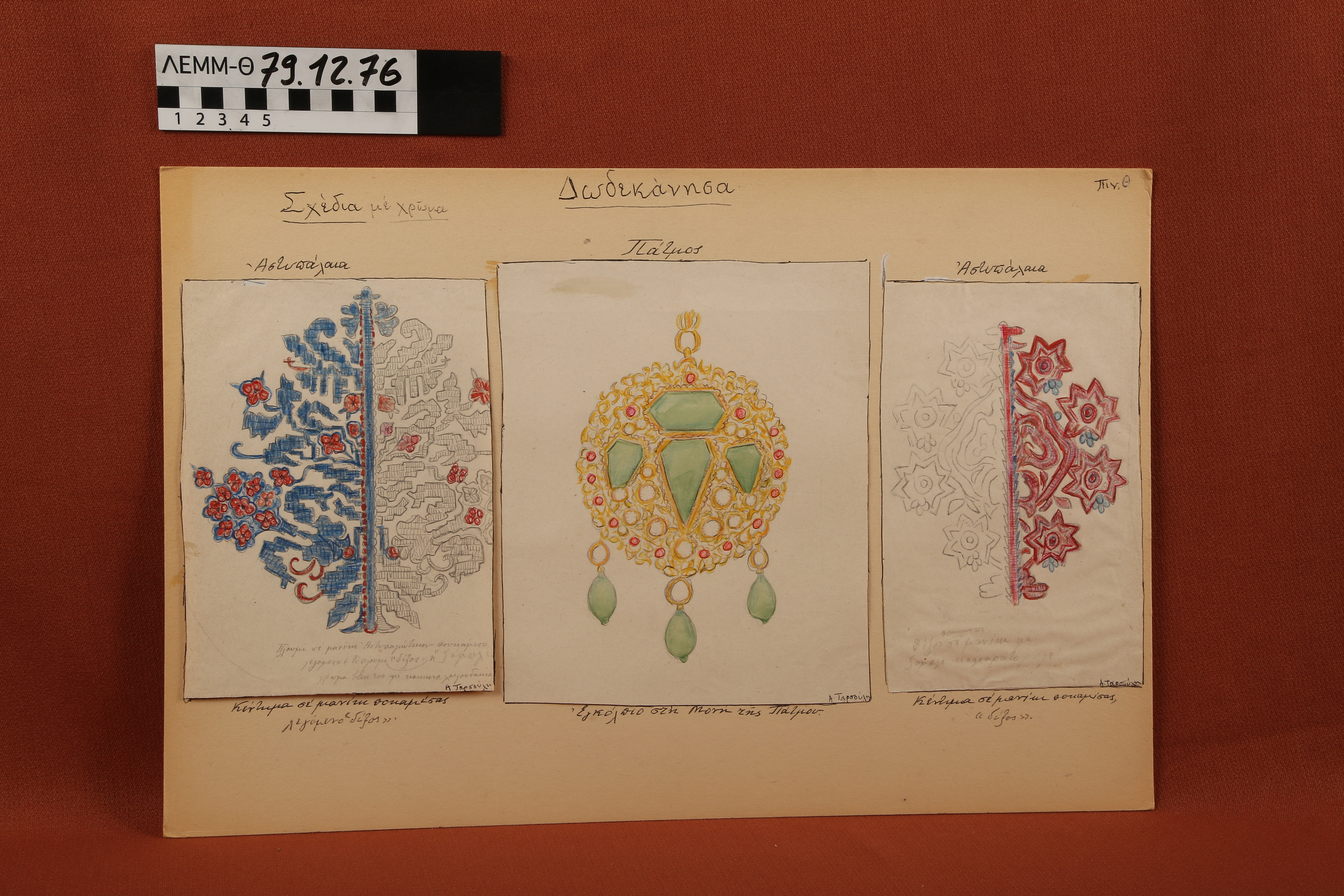 Σχέδια - δύο σχέδια κεντημάτων από την Αστυπάλαια και ένα σχέδιο κοσμήματος (εγκόλπιο) από τη Μονή της Πάτμου
