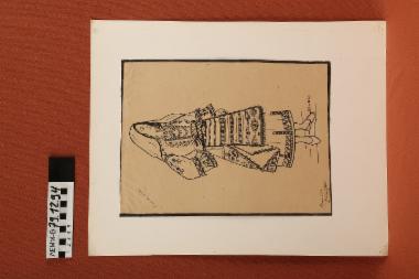 σχέδιο παραδοσιακής ενδυμασίας, ζωγραφισμένο με σινική μελάνη πάνω σε μπεζ φύλλο χαρτιού, επικολλημένο σε υπόλευκο, παραλληλόγραμμο χαρτόνι. Στη δεξιά κάτω γωνία του σχεδίου φέρει την υπογραφή "Α.Ταρσούλη" και στην αριστερή γωνία την χειρόγραφη επιγραφή "Μακεδονία Καπουτζήδες", ενώ στη άνω αριστερή γωνία του σχδίου υπάρχει η επιγραφή, με στυλό, "Θεσσαλονίκη". Στην επάνω δεξιά γωνία του χαρτονιού υπάρχει, γραμμένο με μολύβι, ο αριθμός 11. Στην πίσω όψη του χαρτονιού φέρει, στο κέντρο επάνω, ένα κρικάκι για κρέμασμα κολλημένο με λευκό, κυκλικό κομμάτι υφασμάτινης ταινίας. Φέρει κηλίδες σε όλη την επιφάνεια του χάρτινου πίνακα.