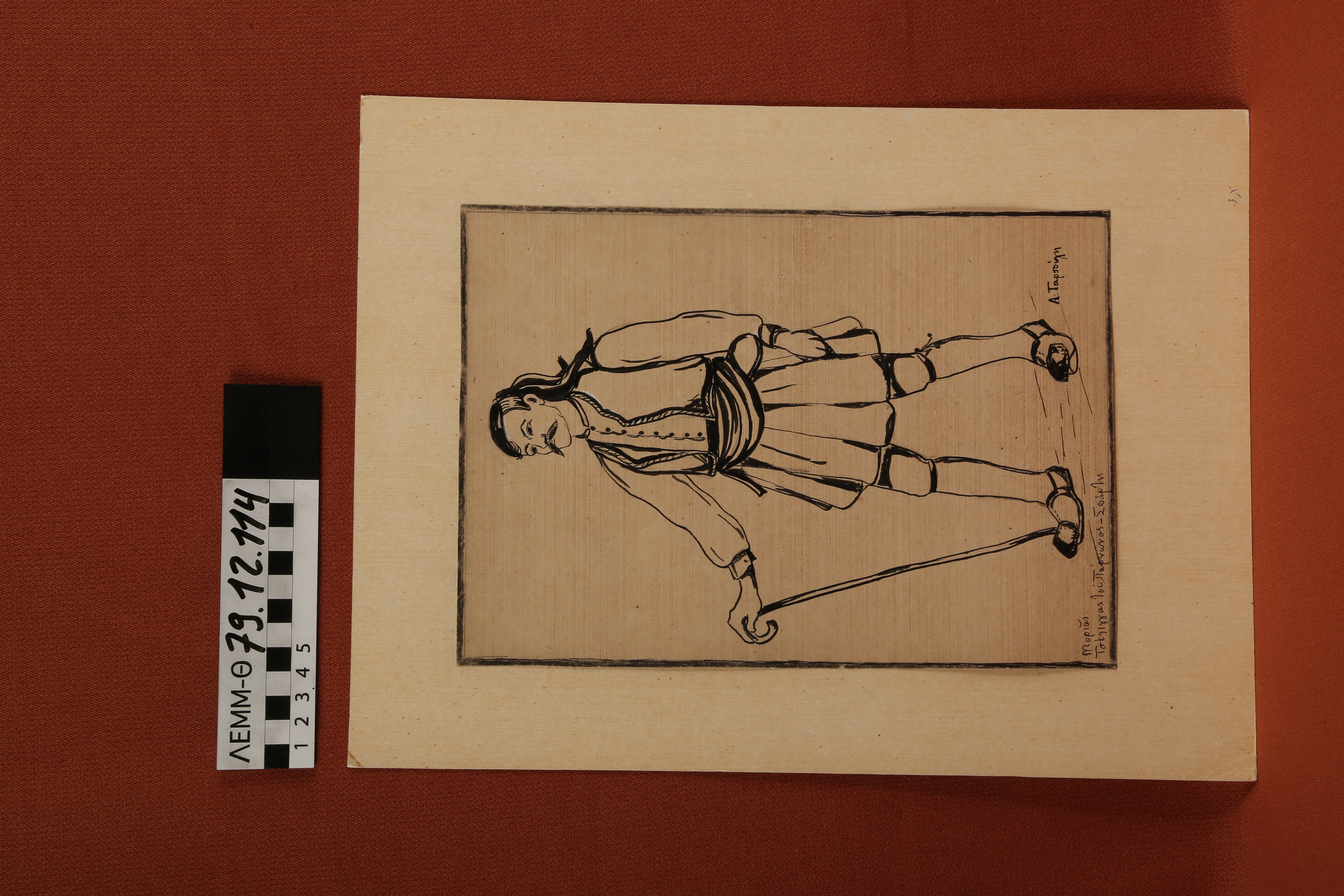 Σχέδιο - σχέδιο, στο οποίο απεικονίζεται τσέλιγγας με παραδοσιακή φορεσιά του Πάρνωνα, Σπάρτης