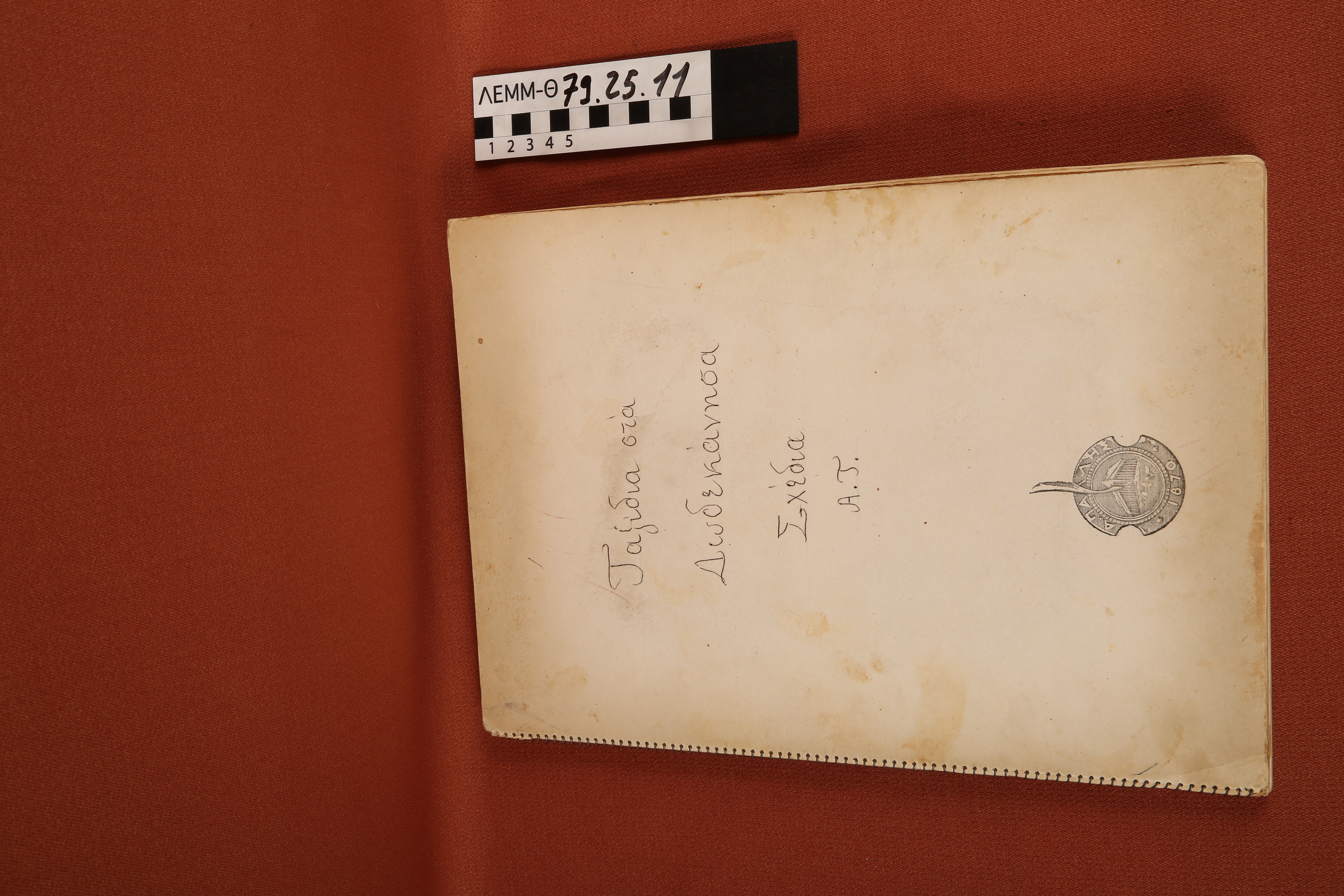 Τετράδιο με σχέδια - τετράδιο με χειρόγραφο τίτλο "Ταξίδια στα Δωδεκάνησα Σχέδια Α.Τ." μέσα σε πορτοκαλί φάκελο με τίτλο "Σχέδια Δωδεκανήσου"