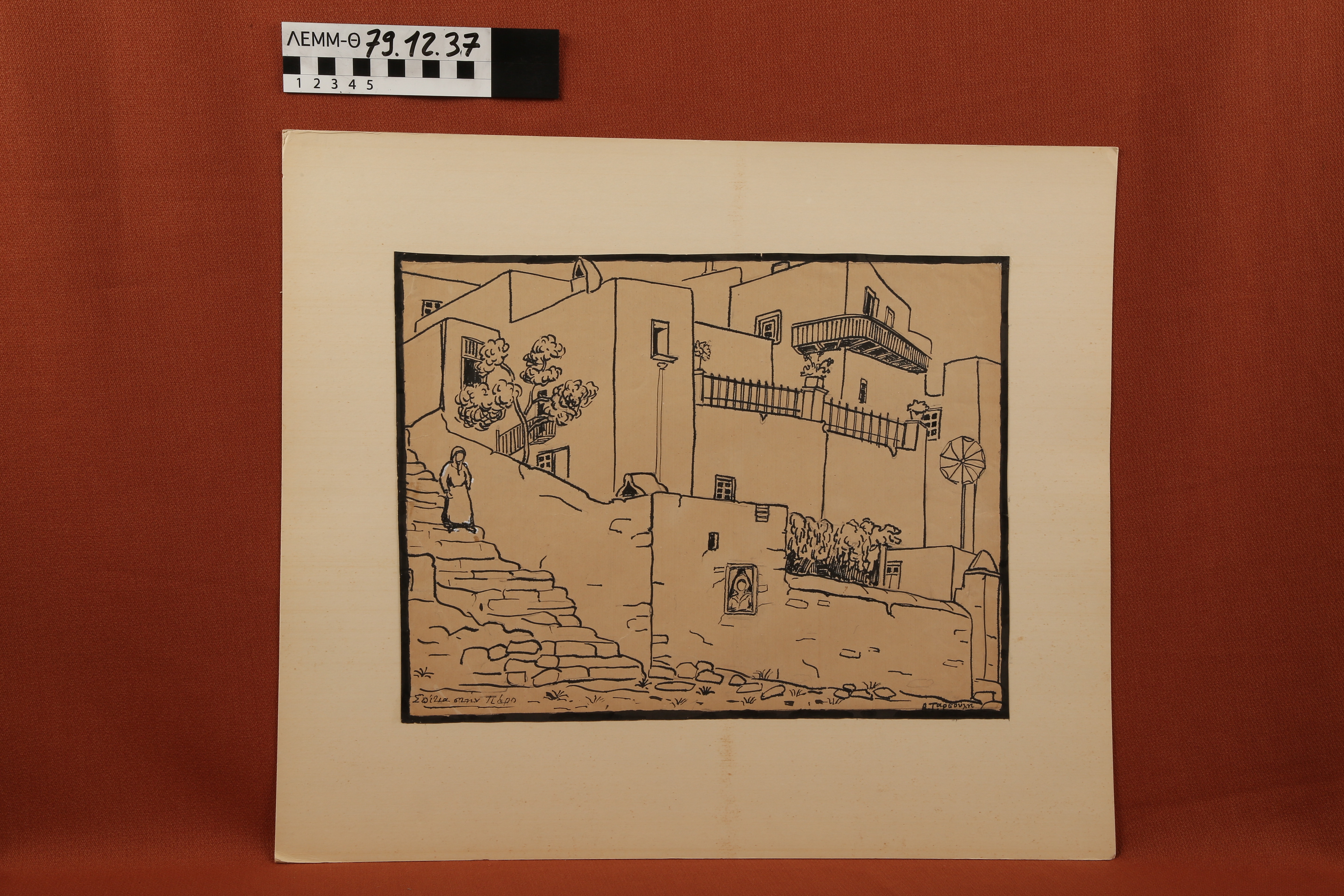 Σχέδιο - σχέδιο, στο οποίο απεικονίζεται το εξωτερικό των σπιτιών στην Πάρο με πλακόστρωτα σκαλοπάτια