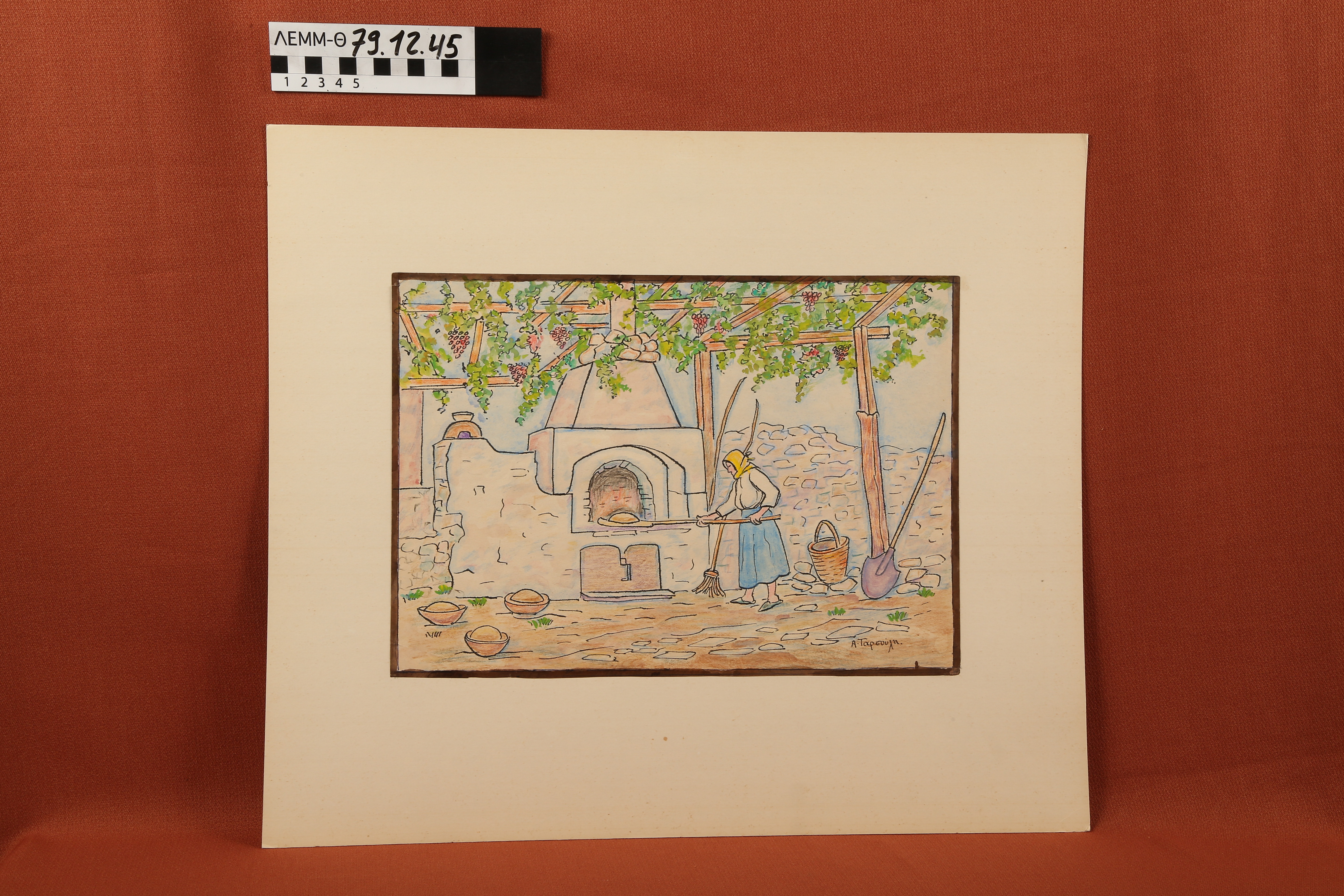 Σχέδιο - έγχρωμο σχέδιο στο οποίο απεικονίζεται γυναίκα μπροστά από χτιστό φούρνο να ψήνει ψωμί