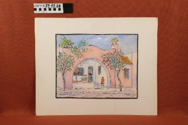 σχέδιο εξωτερικής όψης, παραδοσιακής κατοικίας ζωγραφισμένο με κηρομπογιά και υδρόχρωμα σε γαλάζιο, ροζ, πράσινο, καφέ και μωβ χρώμα, πάνω σε υπόλευκο φύλλο χαρτιού, επικολλημένο σε μεγαλύτερο υπόλευκο χαρτόνι. Στη δεξιά κάτω γωνία του σχεδίου φέρει την υπογραφή "Α.Ταρσούλη" και στην αριστερή γωνία την χειρόγραφη επιγραφή "Λαικό σπίτι στην Κώ". Στην πίσω όψη του χαρτονιού φέρει, στο κέντρο επάνω, ένα κρικάκι για κρέμασμα κολλημένο με λευκό, κυκλικό κομμάτι υφασμάτινης ταινίας. Είναι κιτρινισμένο στην μπροστινή και πίσω όψη του χαρτονιού και φθαρμένο στις άκρες.