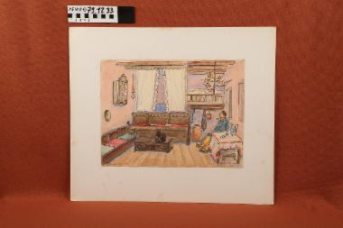 Σχέδιο - έγχρωμο σχέδιο στο οποίο απεικονίζεται η σάλα παραδοσιακής κατοικίας της Τήλου, 1946
