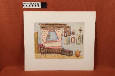 Σχέδιο - έγχρωμο σχέδιο στο οποίο απεικονίζεται η σάλα και η κάμαρα παραδοσιακής κατοικίας της Νισύρου, 1946