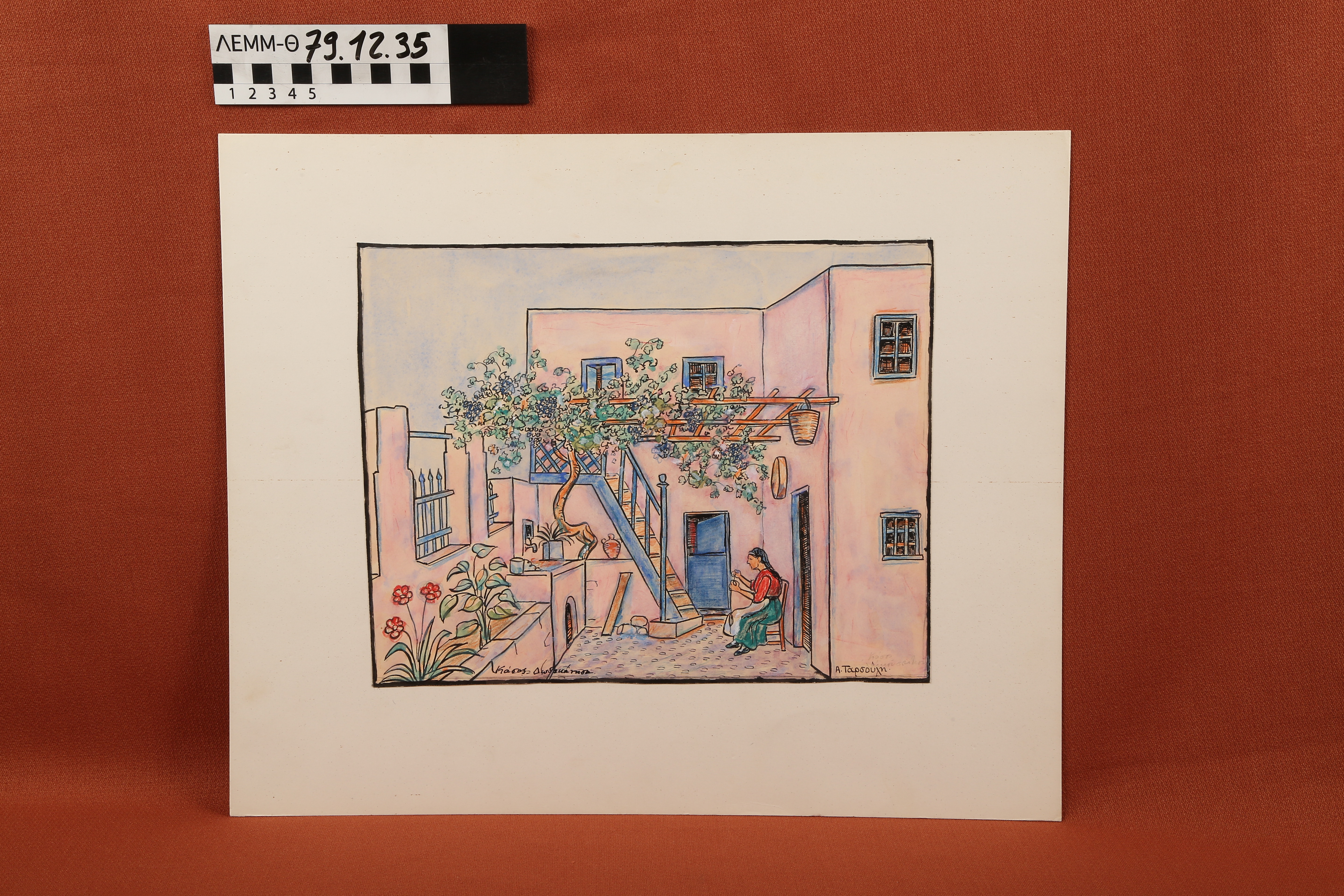 Σχέδιο - έγχρωμο σχέδιο στο οποίο απεικονίζεται η εξωτερική όψη παραδοσιακής κατοικίας της Κάσου και μια γυναίκα καθισμένη να γνέθει