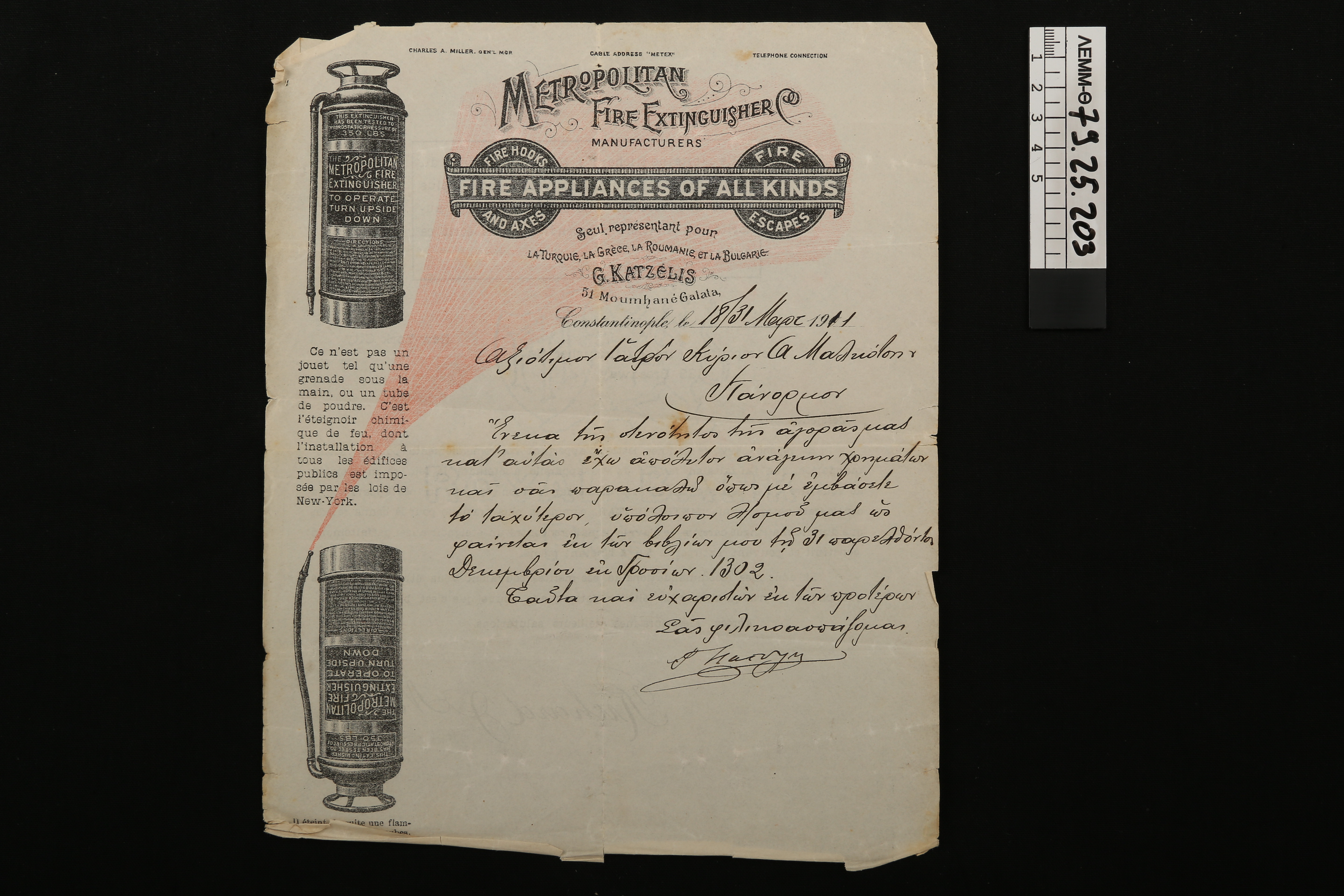 Επιστολή - γράμμα από την εταιρεία "Metropolitan Fire Extinguiser Manufacturers G.Katzelis" προς τον Ιατρό Α. Μαλκότση για την εξόφληση μιας αγοραπωλησίας
