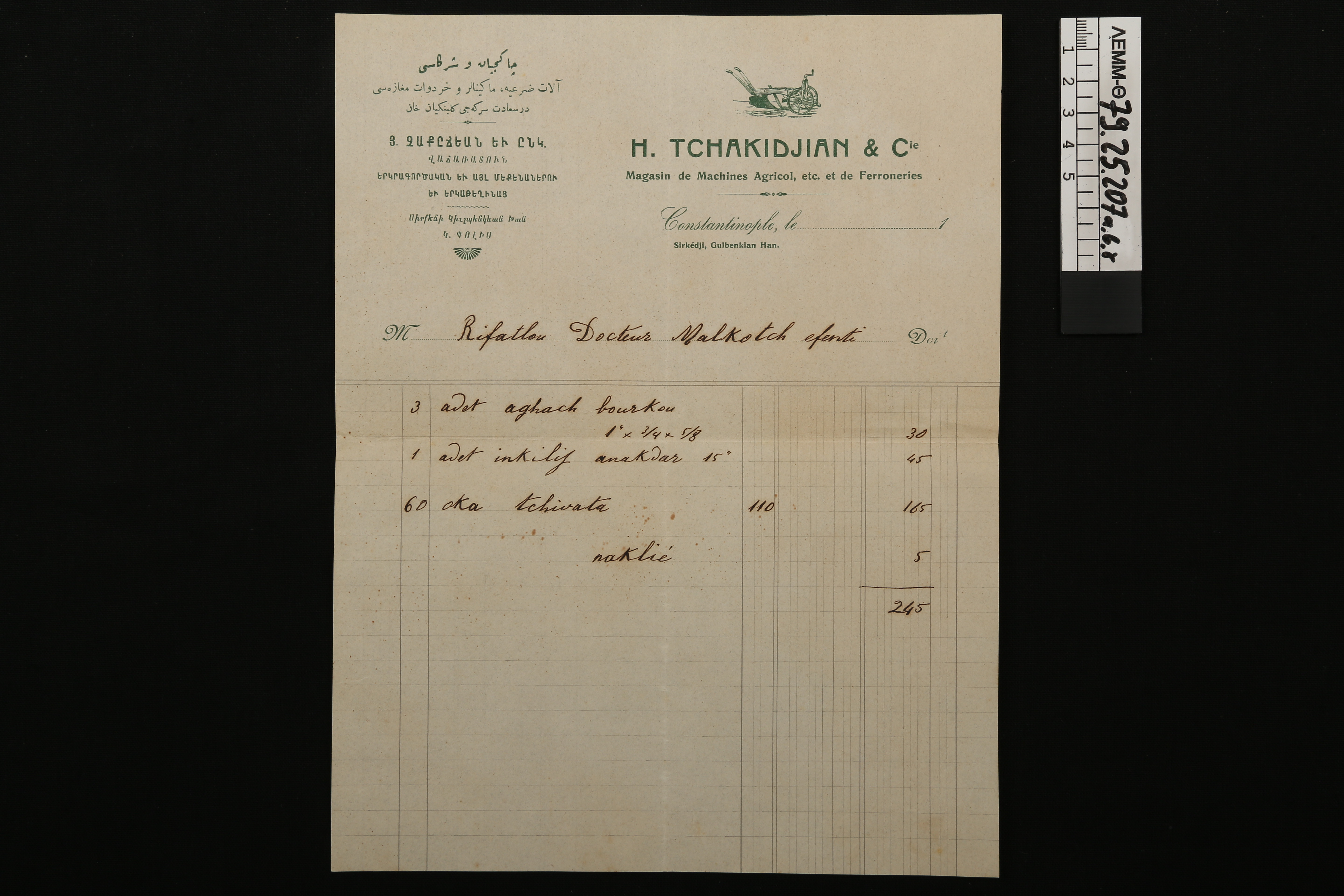 Τιμολόγια - αποδείξεις από την εταιρεία αγροτικών μηχανημάτων "H. Tchakidjian & Cie"