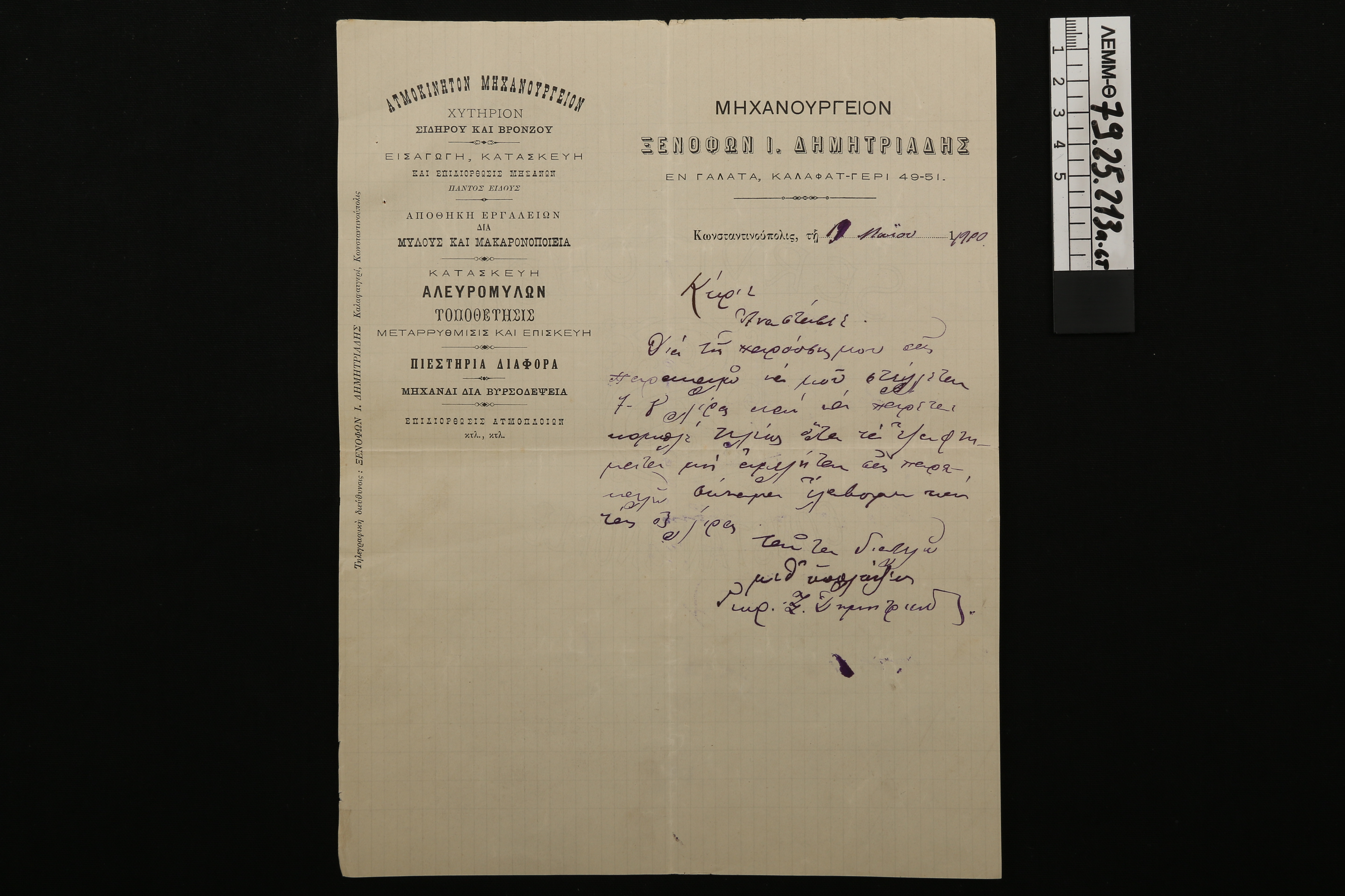 Επιστολές - έξι επιστολές από το "Μηχανουργείον Ξενοφών Ι. Δημητριάδης Εν Γαλατά, Καλαφατ-Γερί" προς τον Α. Μαλκότση, του 1910