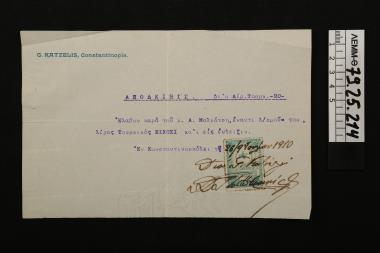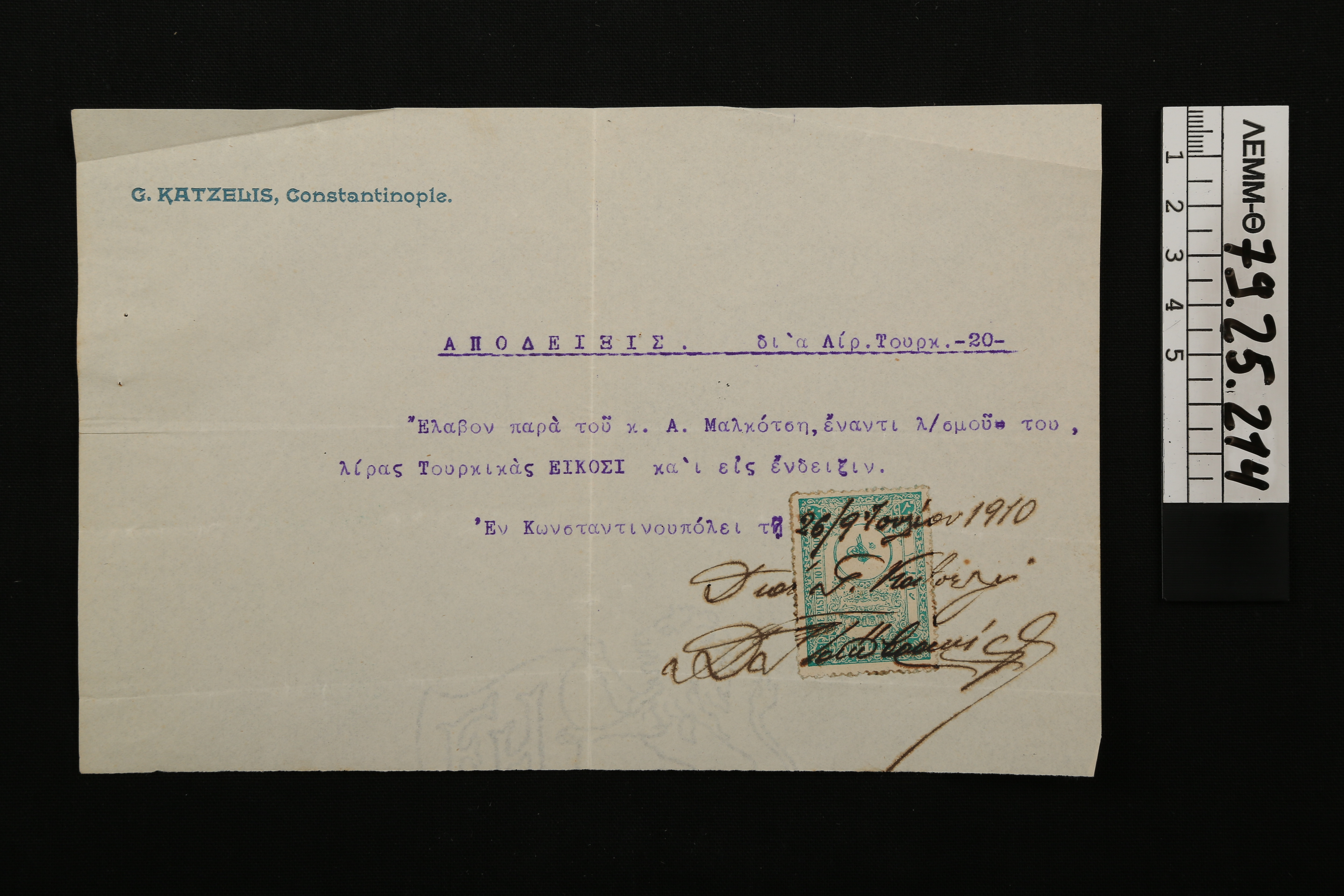 Απόδειξη - απόδειξη από τον Γ. Κατσέλη, ο οποίος έλαβε 20 τούρκικες λίρες από τον Α. Μαλκότση, 1910