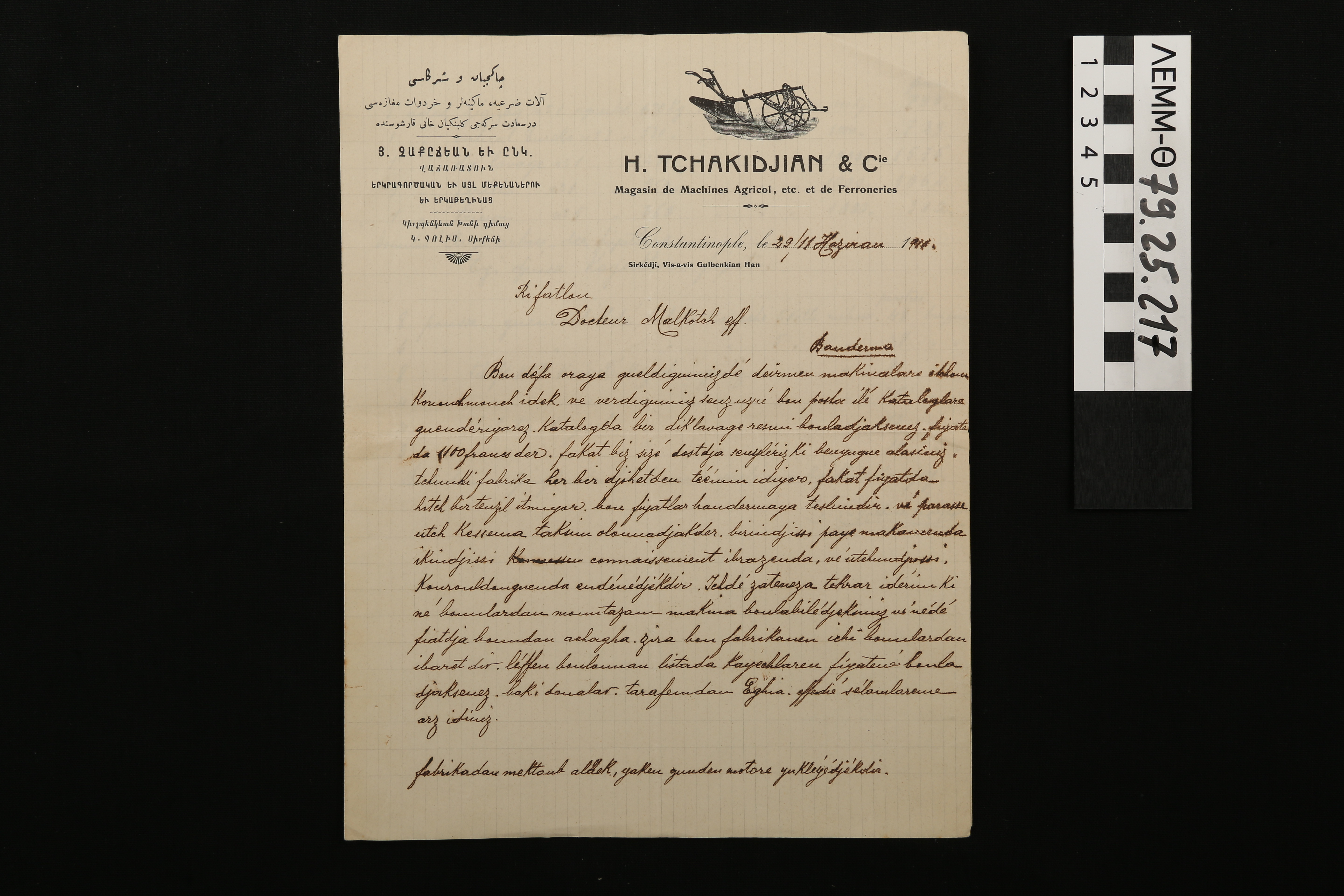 Επιστολή - επιστολή από την εταιρεία αγροτικών μηχανημάτων "H. Tchakidjian & Cie"
