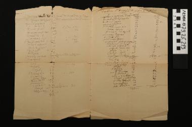 δίφυλλο έγγραφο, σε μπεζ χρώμα, με χειρόγραφες σημειώσεις στις δύο εσωτερικές σελίδες. Στην αριστερή σελίδα υπάρχει μια λίστα εργαλείων και στην δεξιά σελίδα υπάρχει μια λίστα με εργαλεία και άλλα αντικείμενα (κάρβουνα, καυσόξυλα κ.λπ) που παραδόθηκαν στον μύλο.