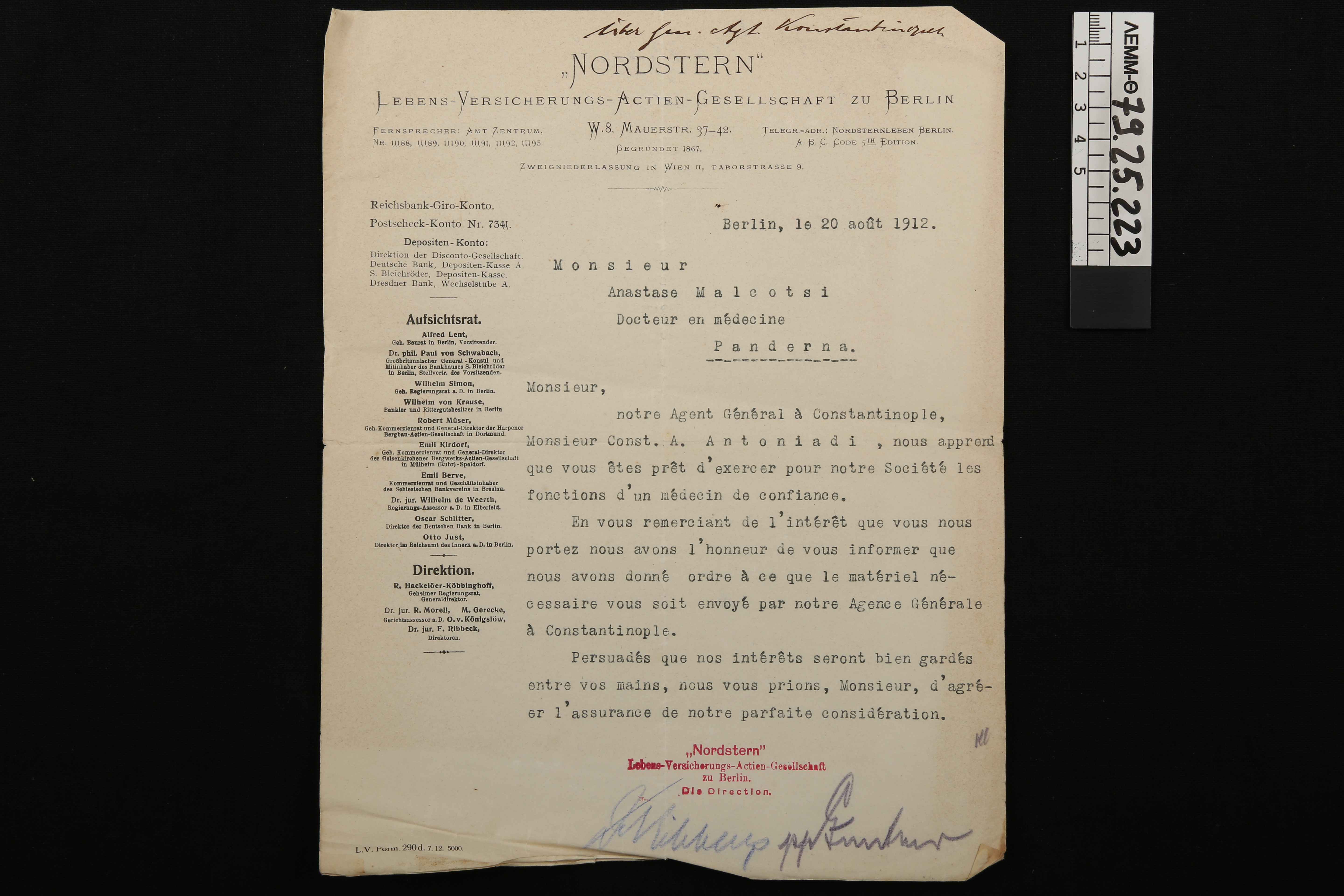 Επιστολή - επιστολή από την ασφαλιστική εταιρεία "Nordstern" προς τον ιατρό Αναστάσιο Μαλκότση