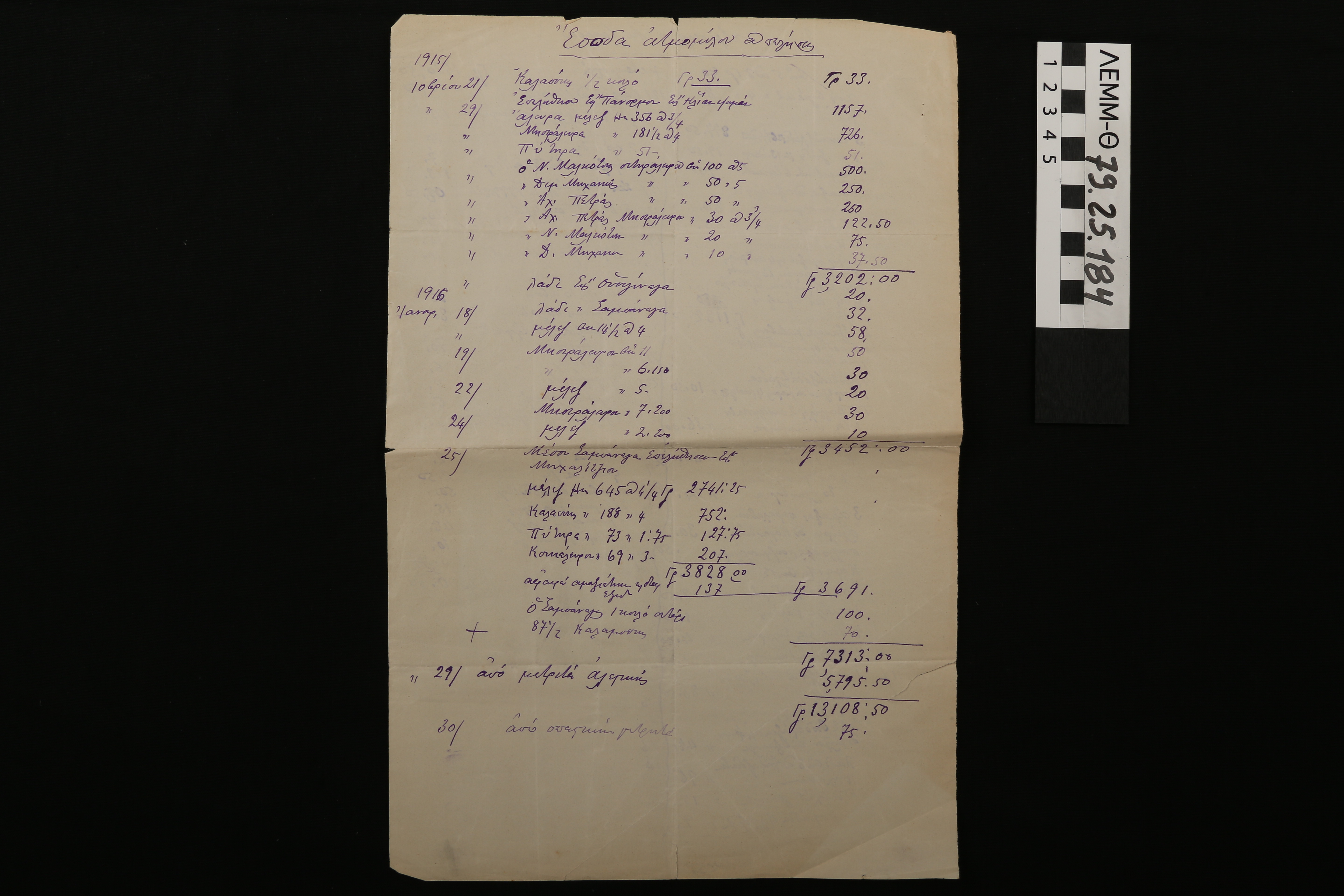 Έγγραφο εσόδων-εξόδων - λίστα εσόδων αλευρόμυλου στο Αγά Ισάρ του 1915-1916 και εξόδων του 1916