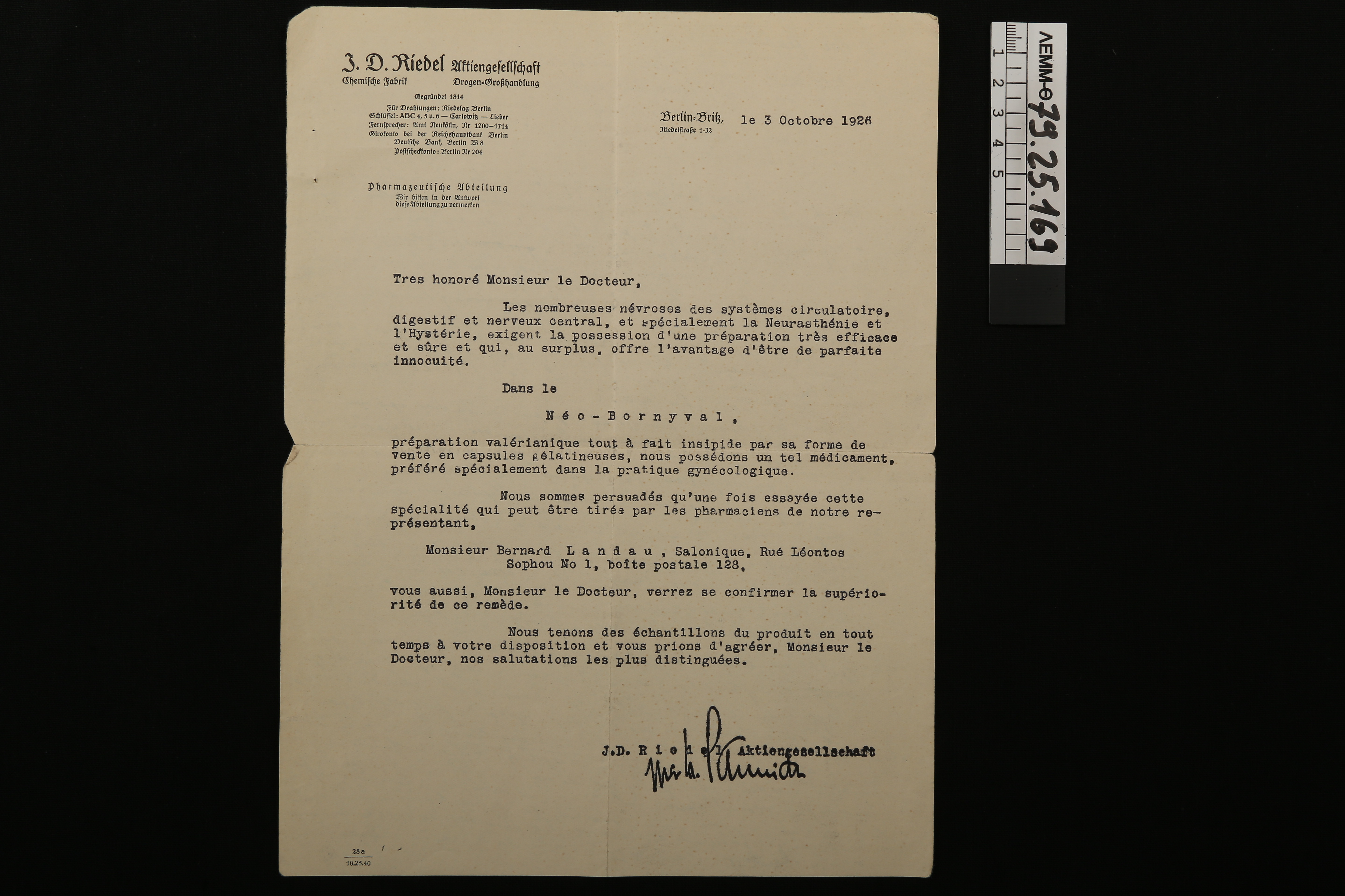Επιστολή - επιστολή από την φαρμακευτική εταιρεία "J.D. Riedel Aktiengesellschaft" προς τον γιατρό Αναστάσιο Μαλκότση, στον οποίο συστήνει το φάρμακο "Neo-Bornyval"