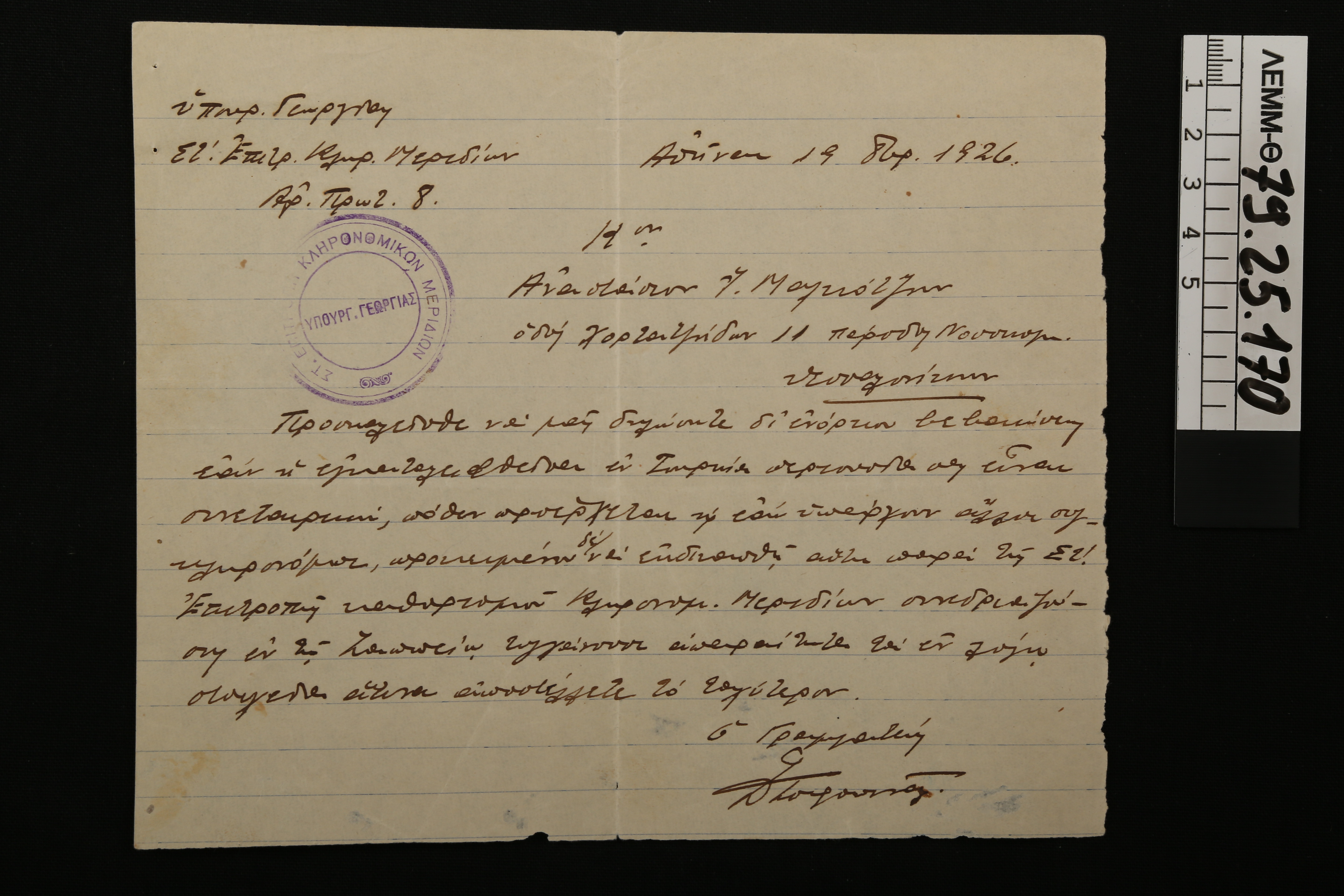 Επιστολή - επιστολή από τη ΣΤ' Επιτροπή Κληρονομικών Μεριδίων του Υπουργείου Γεωργίας προς τον Αναστάσιο Μαλκότση, 1926
