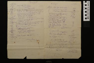 δίφυλλο χαρτί με χειρόγραφες σημειώσεις γραμμένες με μπλε στυλό. Οι σημειώσεις αφορούν τα έξοδα και έσοδα ( Δούναι-Λαβείν), του αλευρόμυλου στο Αγά Ισάρ, του έτους 1915-1916. Στη κορυφή κάθε σελίδας έχει γραμμένο το όνομα Παντελής και δύο κάθετες λίστες, όπου η μία έχει τις επιδιορθώσεις, αγορές, προϊόντα, ενοίκια κ.α., ενώ η δεύτερη έχει τις τιμές σε γρόσια. (EL)