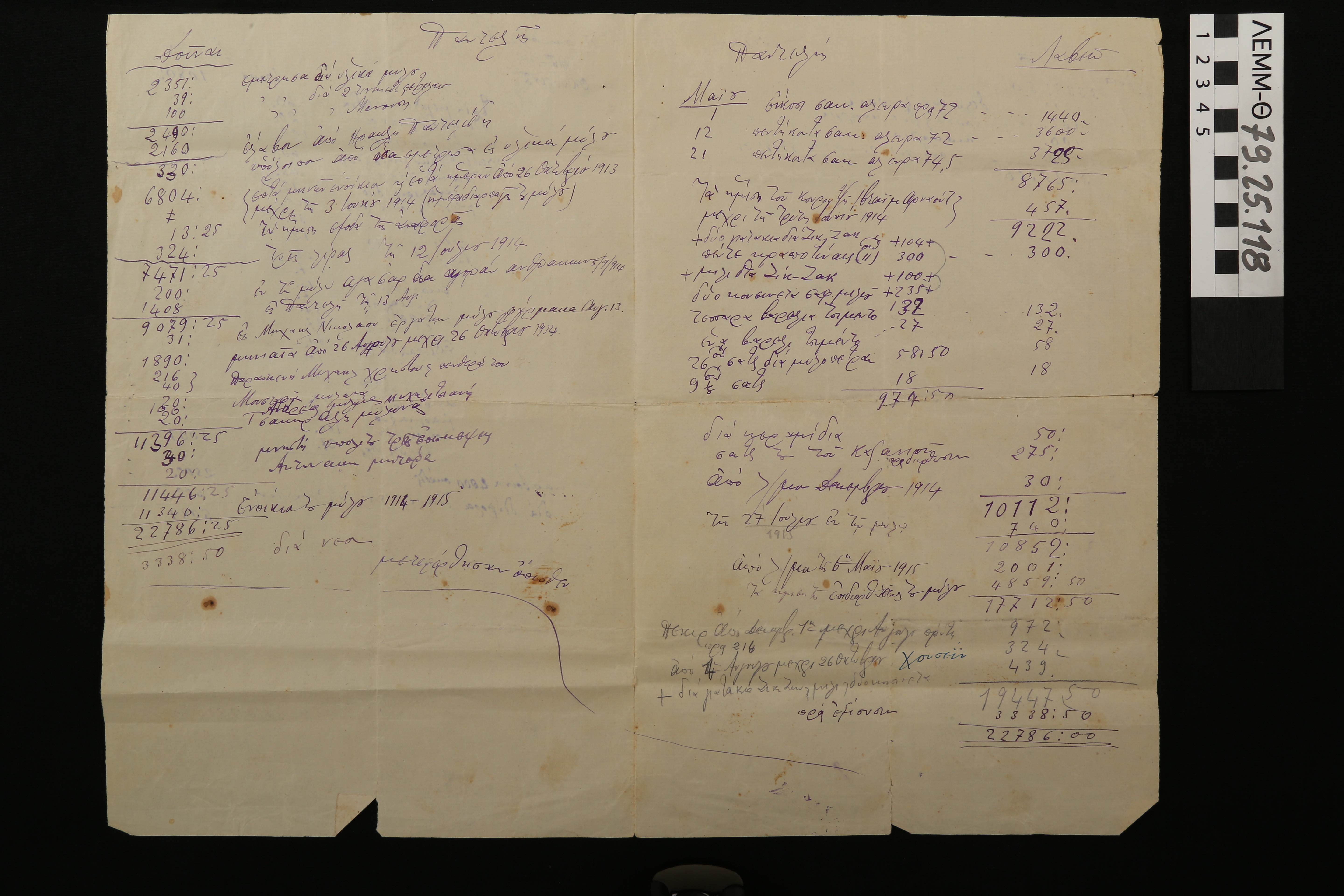 Χειρόγραφο - χειρόγραφες σημειώσεις με τα έσοδα και έξοδα του αλευρόμυλου του Α. Μαλκότση