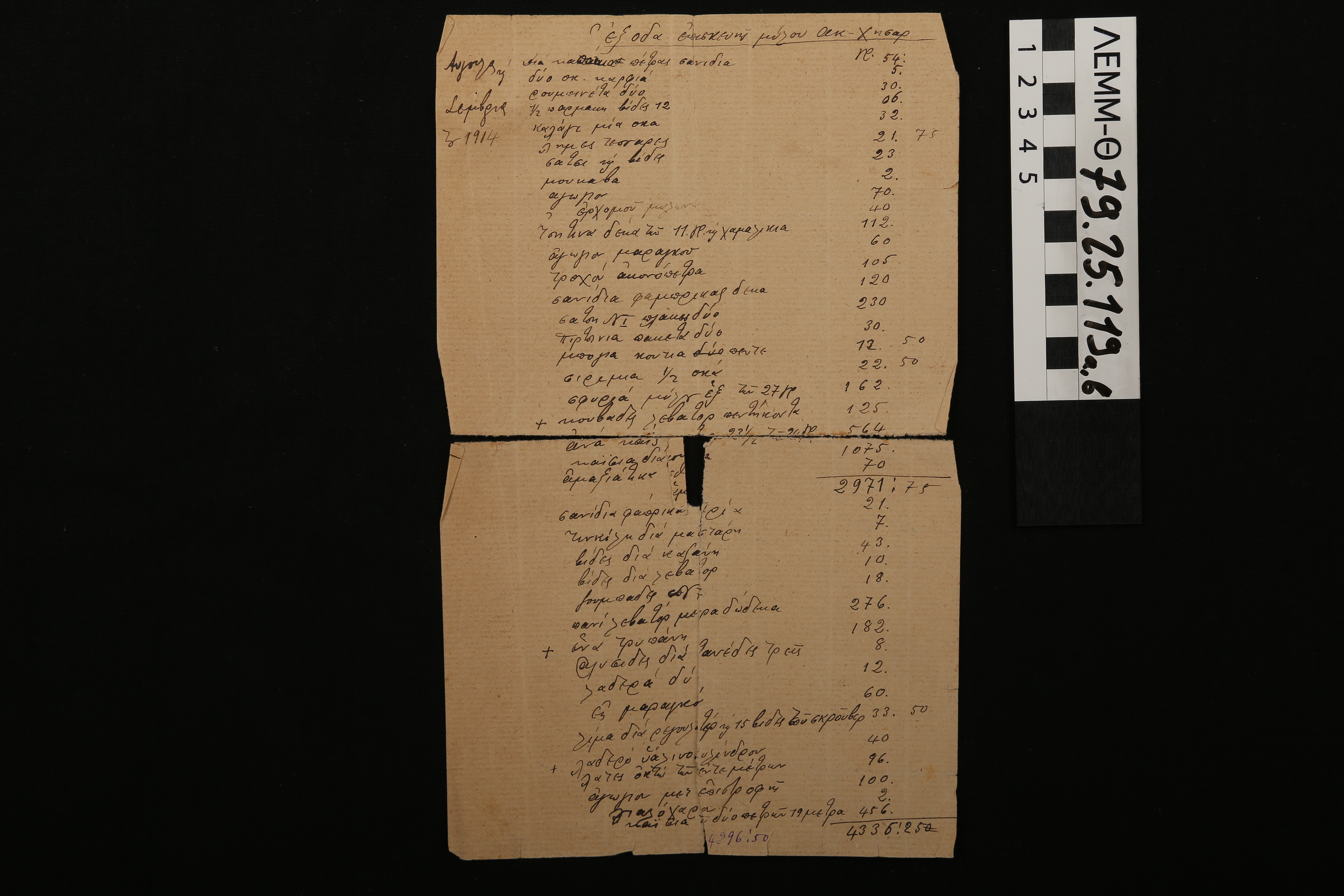 Χειρόγραφο - χειρόγραφο στο οποίο αναγράφονται τα έξοδα επισκευών αλευρόμυλου στο Αγά Ισάρ, του Α. Μαλκότση