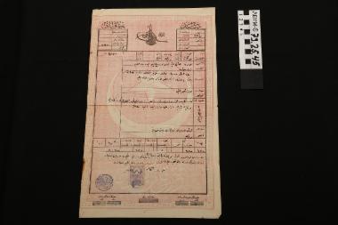 μεγάλο, επίμηκες έγγραφο σε ροζ χρώμα. Η μπροστινή όψη φέρει, περιμετρικά στην άκρη, μπορντούρα (λαβύρινθο) και εντός αυτής έχει ροζ φόντο με λεπτές, κυματιστές κάθετες κι οριζόντιες γραμμές. Στο κέντρο του φόντου υπάρχει το οθωμανικό άστρο της σελήνης (ημισέληνος και πεντάστερο) και από κάτω ιερογλυφικά σε ασπρο χρώμα. Το έγγραφο έχει τυπωμένο πίνακα με πεδία προς συμπλήρωση (συμπληρωμένο με μαύρο μελάνι) και πάνω από τον πίνακα στο κέντρο υπάρχει το μονόγραμμα του Σουλτάνου (τουρά). Στο κάτω μέρος υπάρχει επικολλημένο χαρτόσημο σε μωβ χρώμα και δύο κυκλικές σφραγίδες. Στην πίσω όψη υπάρχει η χειρόγραφη σημείωση, με μολύβι " έγγραφον οικοπέδου Μαριάνθη αγοράσθην ιερά της Καραιά 1911". Φέρει κηλίδες.