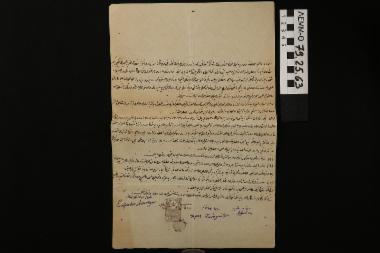 ορθογώνιο έγγραφο σε μπεζ χρώμα, με υδατογραφημα σε ολόκληρη την επιφάνεια (ρόμβοι με δικέφαλο αετό). Φέρει εκτενές κείμενο σε οθωμανική γραφή, υπογραφές των "Ευστράτιος Αποστόλου- Χρης Παναγιούτου- Μαλκότση" και ένα επικολλημένο χαρτόσημο σε καφετί χρώμα.