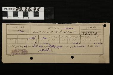 μικρό, μακρόστενο έγγραφο με δύο μικρές οπές (από διατρητικό μηχάνημα) στο κάτω μέρος. Στη μπροστινή όψη φέρει ένα τυπωμένο πίνακα με συμπληρωμένα πεδία (με μπλε μελάνι) και μια κυλινδρική σφραγίδα στην κάτω, αριστερή γωνία. Στην πίσω όψη υπάρχει ένα κείμενο σε οθωμανική γραφή.
