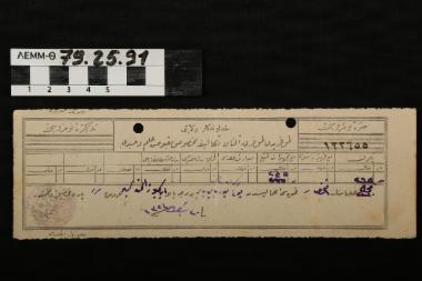 μικρό, μακρόστενο έγγραφο με δύο μικρές οπές (από διατρητικό μηχάνημα) στο πάνω μέρος. Στη μπροστινή όψη φέρει ένα τυπωμένο πίνακα με συμπληρωμένα πεδία (με μπλε μελάνι) και μια κυκλική σφραγίδα στην κάτω, αριστερή γωνία. Στην πίσω όψη υπάρχει ένα κείμενο σε οθωμανική γραφή και η χειρόγραφη σημείωση "Σεπτεμβρίου 1910 - Μαρτίου 1911 265 γρ. χρυσά ντεμινες του μύλου".