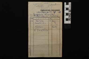 μικρό φύλλο χαρτιού από μπλοκ αποδείξεων, "Τιμολόγιον Πωλήσεως". Στην μπροστινή όψη φέρει τα στοιχεία του πελάτη (Γρηγόρη Κουρέντα) συμπληρωμένα με μπλε στυλό και ένα πίνακα με στοιχεία του προΐόντος που αγοράστηκε (πατάτες Νευροκοπίου για 300 δρχ.). Στο πάνω μέρος του τιμολογίου υπάρχουν δύο σφραγίδες, μια κυκλική με την επιγραφή "Οικονομικη Εφορία Νευροκοπίου" και στη δεύτερη σφραγίδα αναγράφεται "Χ. Αναστασιαδης Θ.- Τσαπάλης Εμπειροτέχναι Κ. Νευροκόπι". Στην πίσω όψη υπάρχουν χειρόγραφες αριθμητικές πράξεις με μολύβι.
