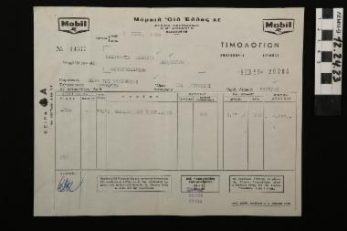 μονόφυλλη απόδειξη σε ορθογώνιο σχήμα μεσαίου μεγέθους με τον αριθμό Νο 14577. Στην μπροστινή όψη φέρει τυπωμένα το λογότυπο της εταιρείας (στις γωνίες αριστερά και δεξιά) "Mobil" και ένα μικρό σχέδιο πήγασου. Στο επάνω μέρος αναγράφονται τα εξής: "Μόμπιλ Όϊλ Ελλάς Α.Ε. εταιρεία Πετρελαίων Ν. Μεγ. Αλεξάνδρου 30 Θεσσαλονίκη" και τα στοιχεία του πελάτη με κεφαλαία γράμματα "Επωλήθησαν εις: Ελευθερία Κορέντα Παν/λείον Ασβεστοχώριον". Ακολουθεί πίνακας με τα στοιχεία του προιόντος και το ποσό (2537 δρχ.).